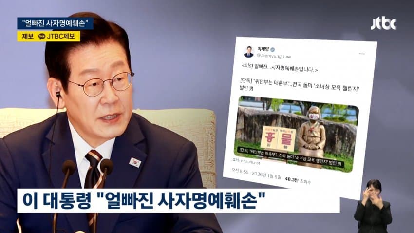 이재명 대통령은 소셜미디어에 관련 보도 링크를 공유하며 "얼빠진 사자명예훼손"이라고 강도 높게 비판함
