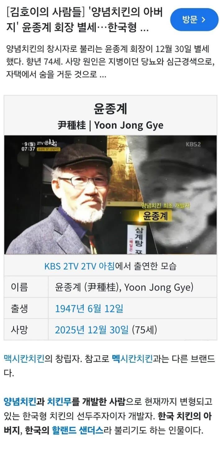한식의 선두주자 한식의 신이 별세하셨네요.....양념치킨 아니였으면 한국 치킨 체인점이 다른 나라에 있을수도 없었는데