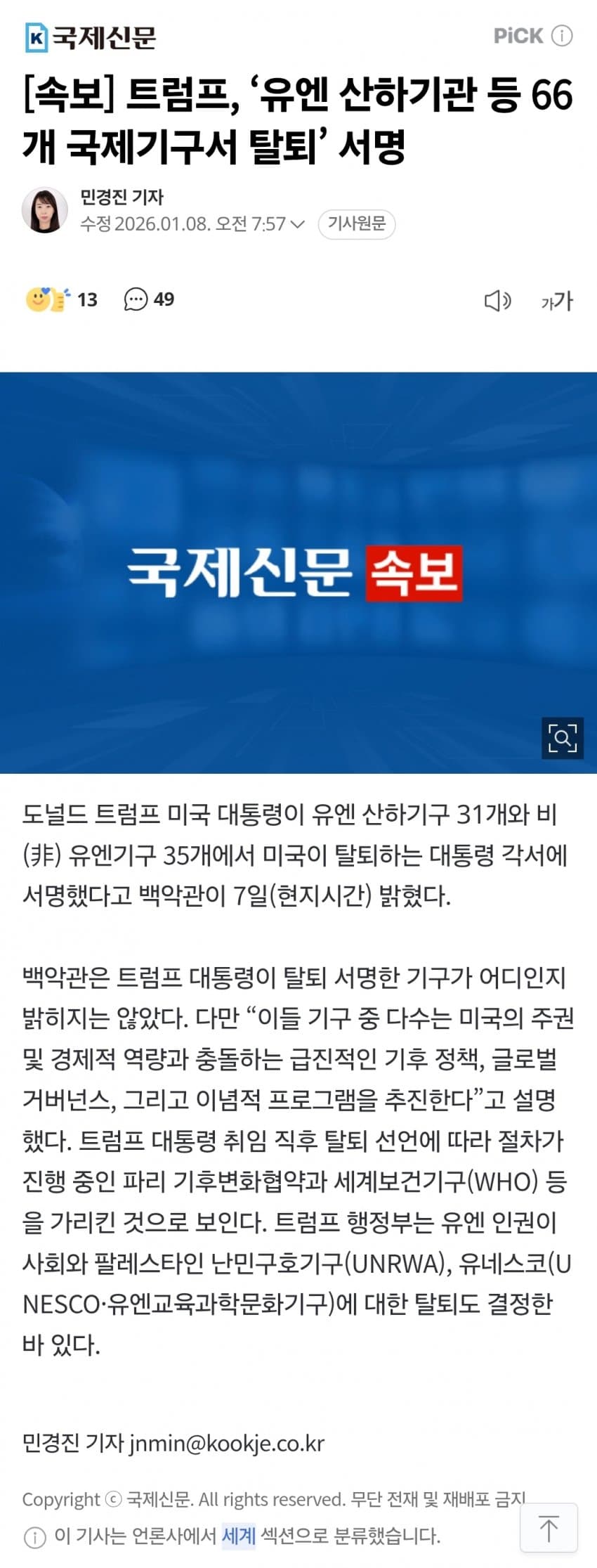 그간의 UN 운영 모양세가 한국의 공인중개소 같은 행태를 보이니 미국이 돈값 못하는 UN 내다버린거지 패권국 미국탈퇴 여파로 이제 UN은 더이상 국제기구로서의권위를 상실하고 이후 미국주도하에 새로운 기관들이 영향력과 파워를 주도하게될듯