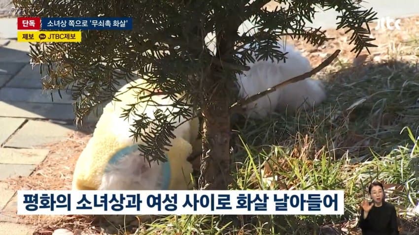 평화의 소녀상과 산책하던 여성 사이로 날아간 건데 정확히 누구를 노린 건지는 아직 파악되지 않았음