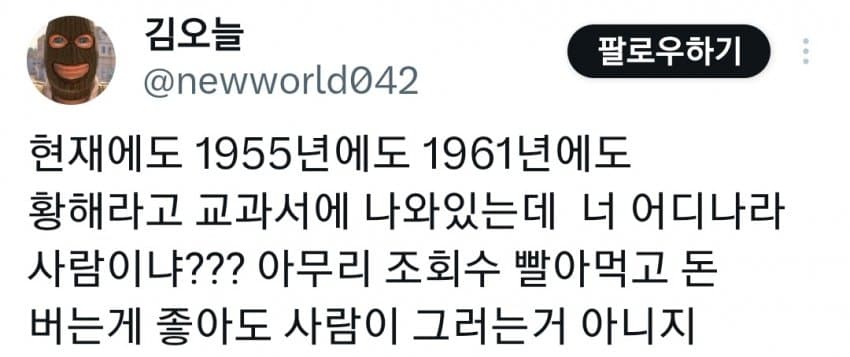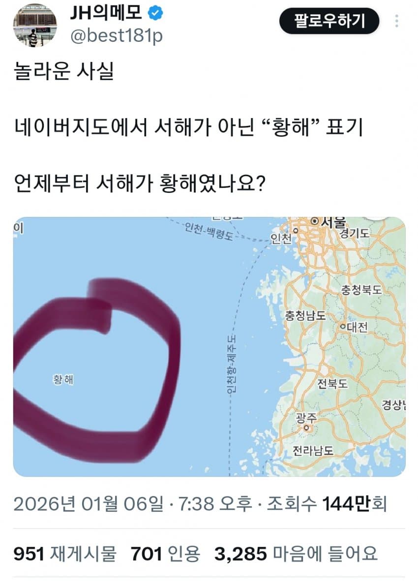 사실은 '서해'라는건 비속어 같은거임, 원래 공식은 황해야 근데 '동해'가 있으니까 반대는 '서해'구나 남쪽은 '남해'구나 이러면서 공식 무시하고 비속어처럼 써대던게 서해인거임