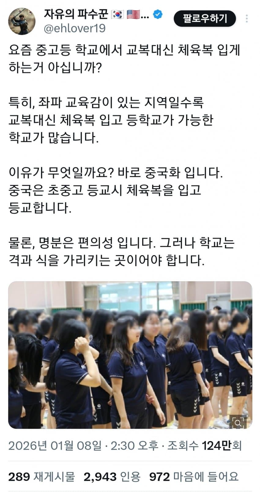 체육복 입고 등교 중국화 어쩌고는 모르겠고나는 중학교 교복 안 입히는 학교가 늘어나서 아쉬움중학교 여자애들 교복 입히면 알아서 줄여입는데새하얀 블라우스랑 교복치마가 몸매를 강조하면 진짜 개꼴림한창 때 여자애 냄새가 교복에 잔뜩 배일걸 생각하면 진짜더이상 바랄 게 없ㅇ므