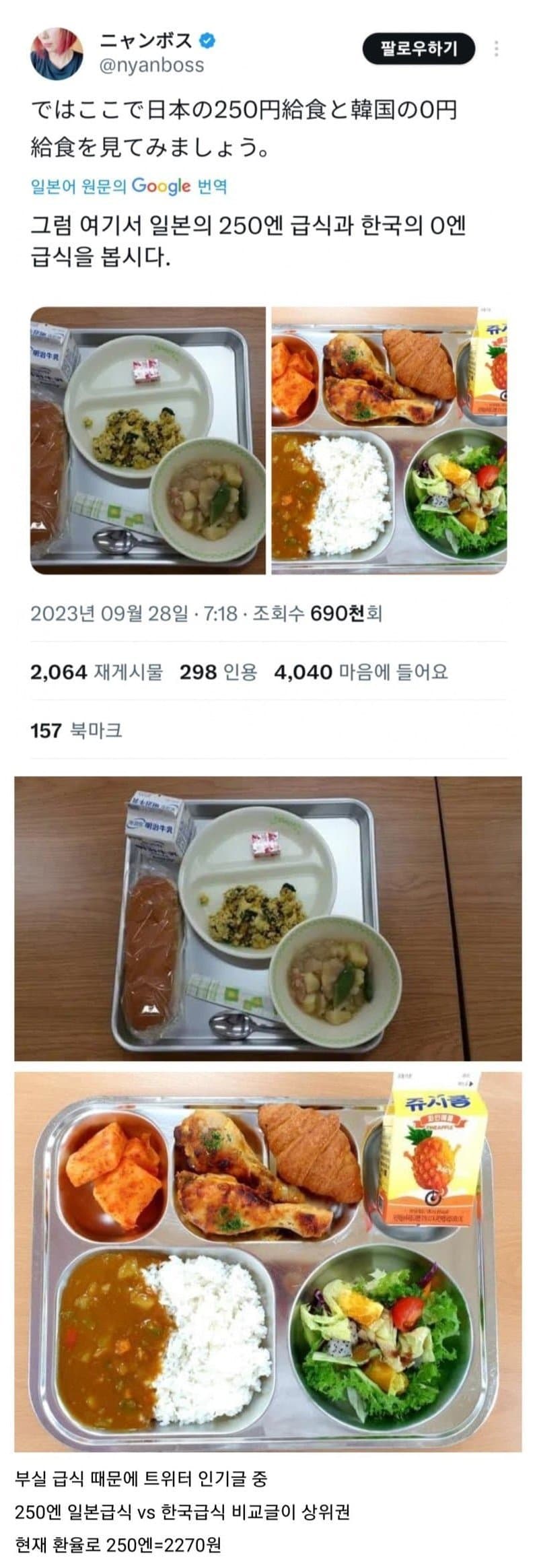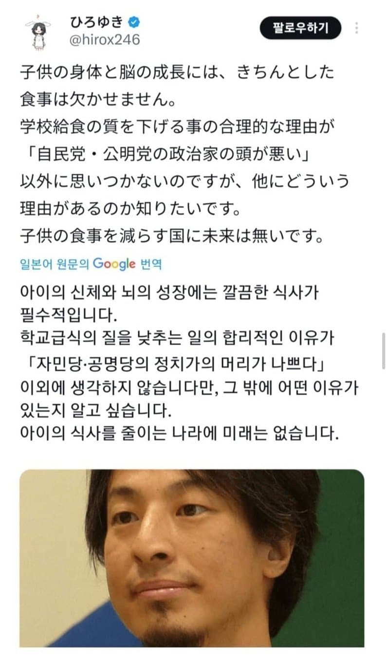 초등학교 기준으로 한 끼당 단가가 일본이 290엔 한국이 4000원인데돈은 거짓말을 안 하지 않나?