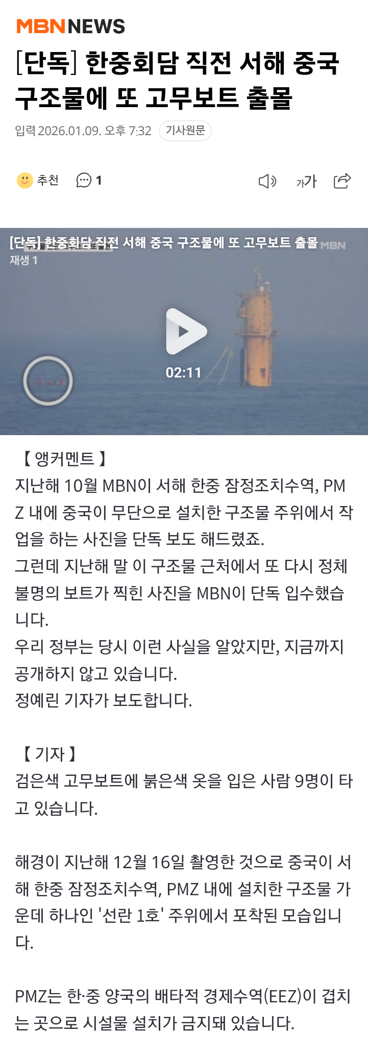 [단독] 한중회담 직전 서해 중국 구조물에 또 고무보트 출몰
