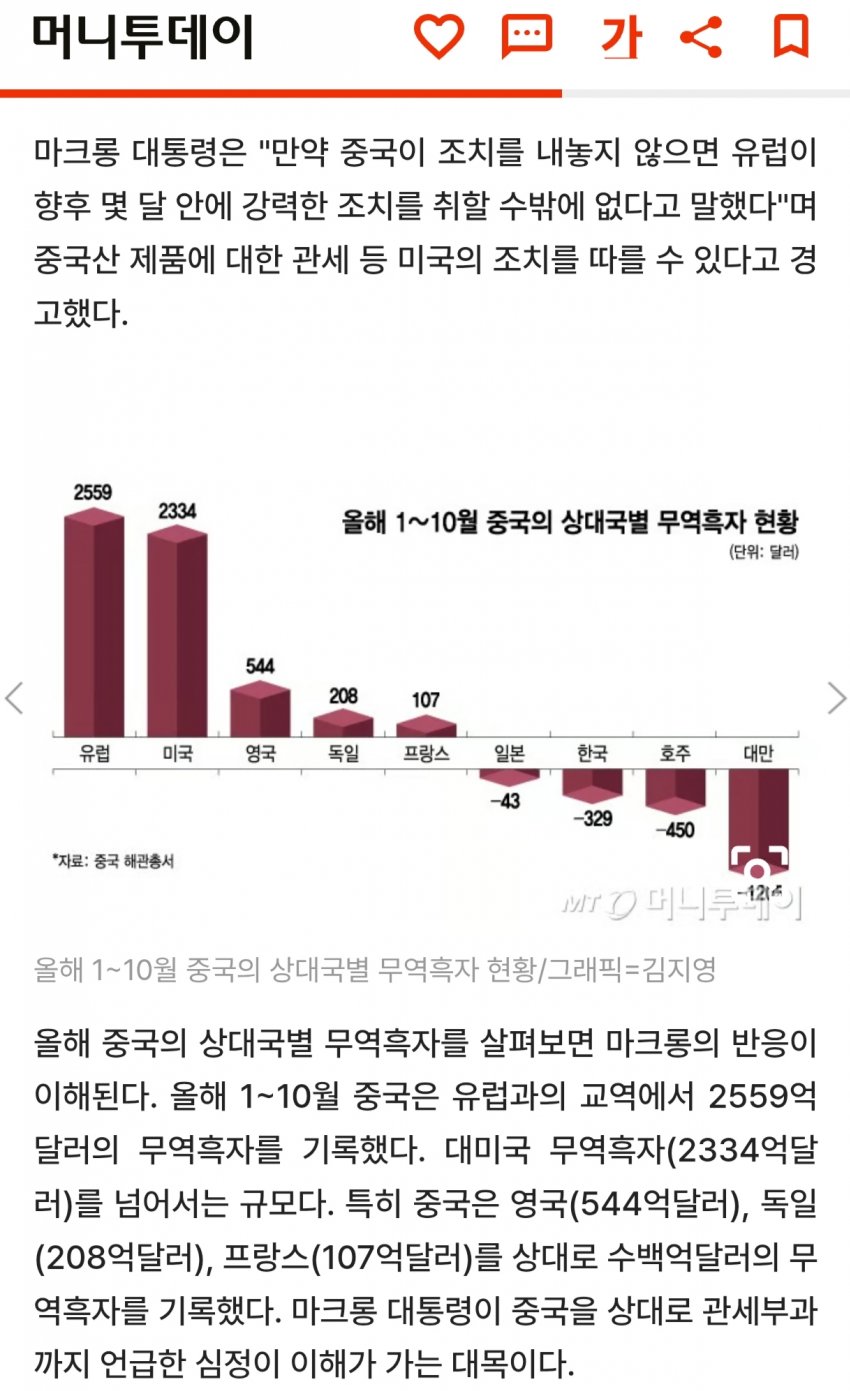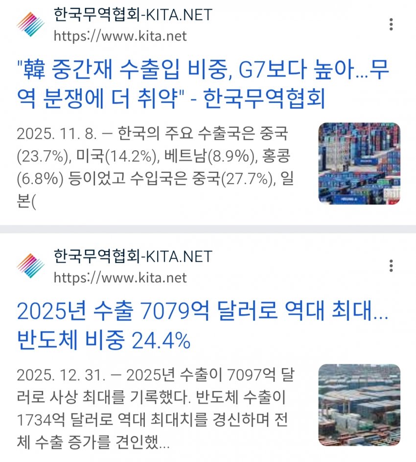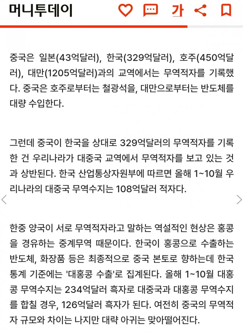 저 기사에 따르면 중국, 홍콩을 합치면 결국 무역 흑자라는 건데 한국이 홍콩을 제외하여 집계하여 대중 무역 적자라고 하는 거고중국은 홍콩까지 중국으로 합쳐서 대한 무역 적자라고 하는 거고그러면 결국 홍콩을 합친 대중 무역이 흑자라는 건데 뭔 소리고? 와 근데 대중 무역이 흑자였네?ㅋ하여간 언론은 믿을게 안돼~그나저나 반도체빨이 세긴 하네 반도체 없었음 무역적자였을건데ㅋㅋ