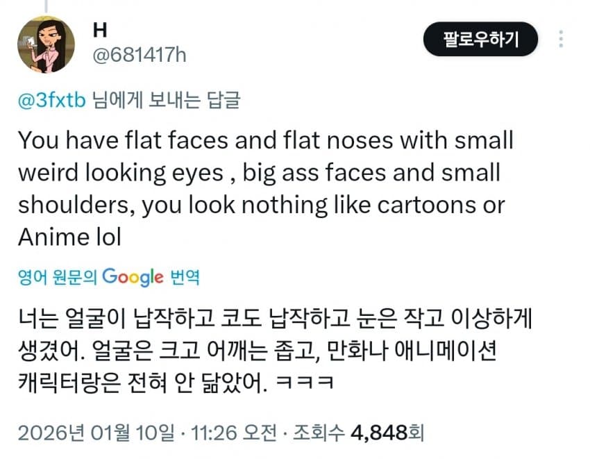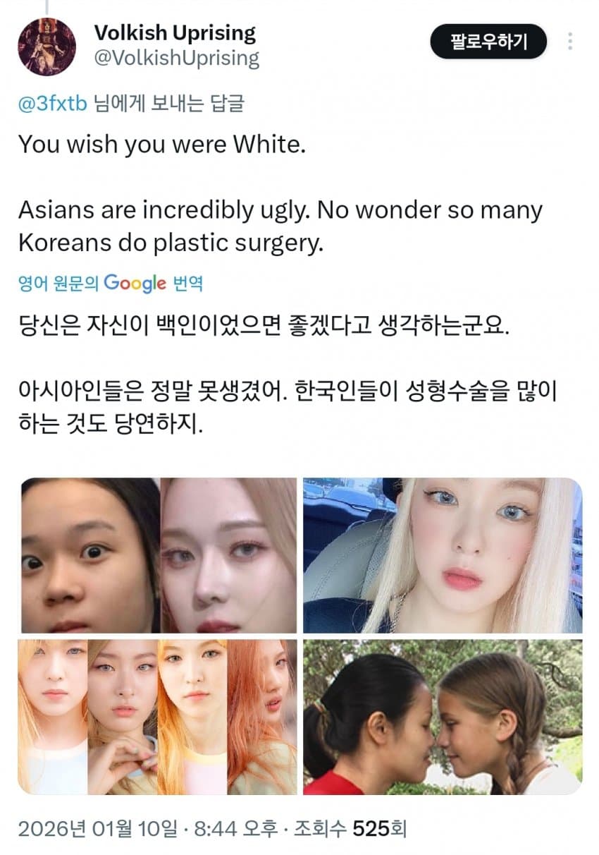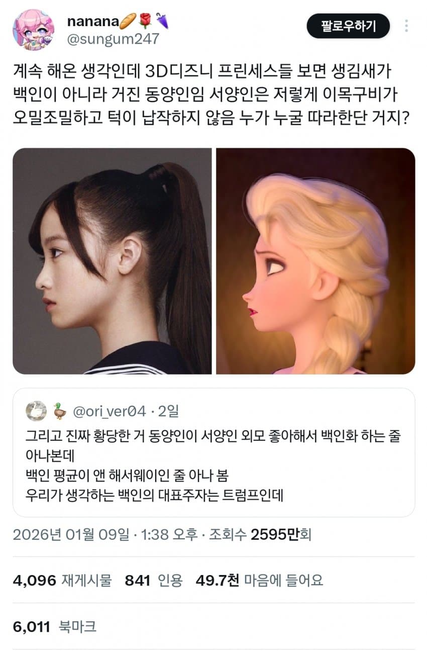 저런 멍청한싸움은 왜 거는지 모르겠음, 정작 백인들은 상대가치도못느끼고 신경도안쓰고 뭔 아랍애들이랑 싸우더만, 아니 엘사가 스칸디나비아 애들을 모델로 만든건데 북유럽을 외모로 어케이길건데, 계란으로 바위치기인데. 걍 동양적특징을 사랑해서 그걸 밀고가야지 ;;; 찢어진눈을 예쁜걸로 밀고가야지 누가 더 눈이큰지로 싸우면 당연히 유럽인들이 눈이더크지 동양인들이 눈이더크겠냐? 눈이크다는거자체가 유럽인들 특징인건데; 이해가안가네