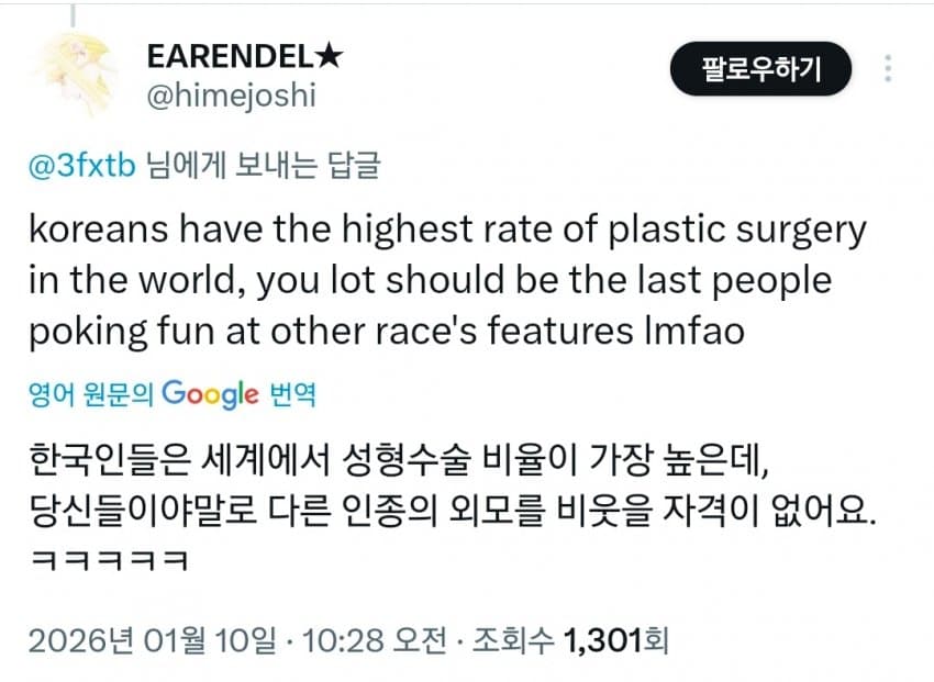 저 성형대국 드립도 2000년대 초반 2ch 개백수들이 퍼뜨린건데 참 오래도 가네, 걔들도 한국문화시장 규모가 이렇게 거대해질줄은 몰랐지 걍 한국인만 핀포인트로 조롱하려고 만든 드립들이었는데, 결국 한국인들이 동북아인들 외모 대표가 되버리면서, 덩달아 지들 젊은세대들까지 한국인들이랑 똑같이 '성형하는 똥양인'으로 조롱당하고 있더라, 4050세대 똥폭탄 유탄으로 맞는건 한국일본 102030세대들의 공통점임