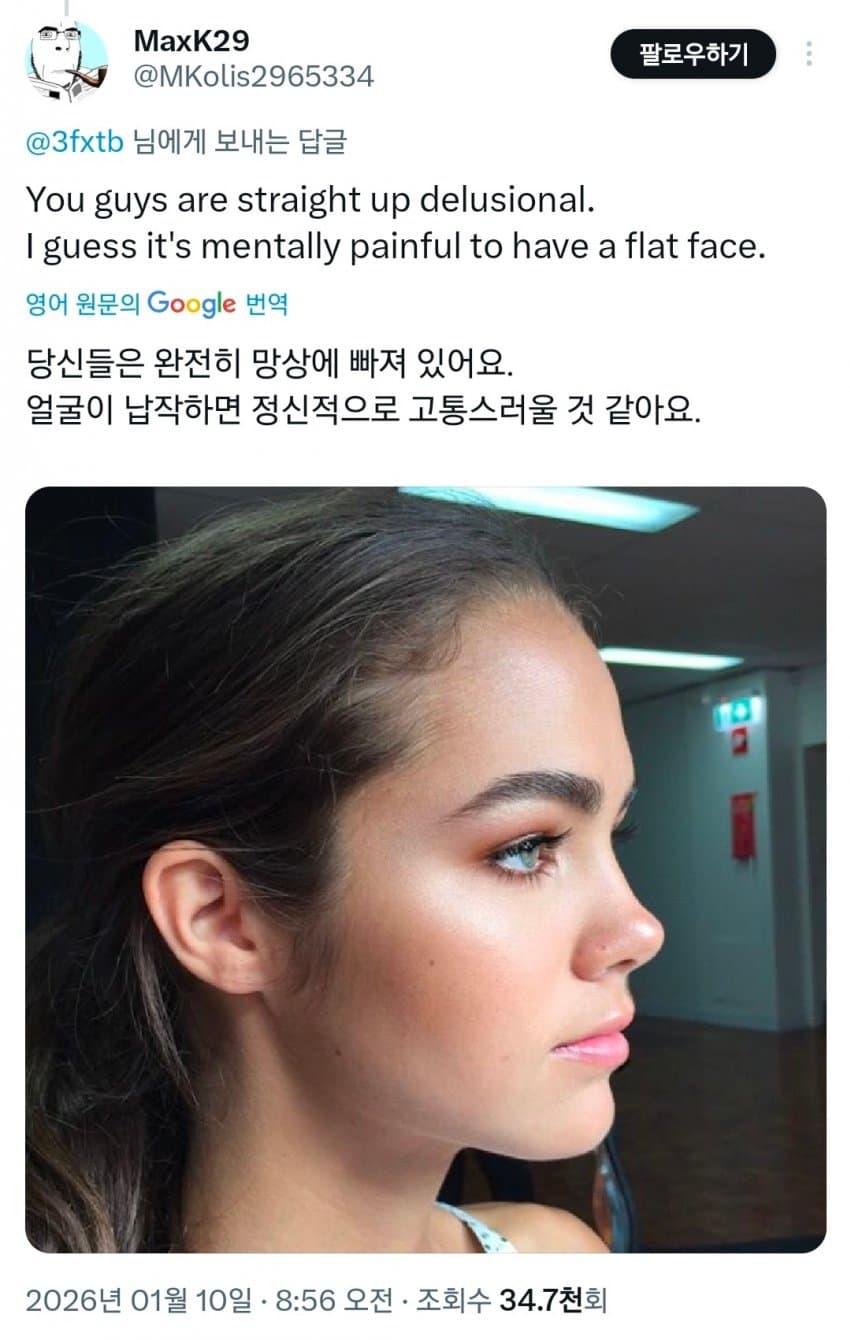 현실른 강남 홍대 나가봐도 몽골에 따먹힌 몽골리안 두툼한 째진눈이 대부분임 남자는 강호동눈 여자는 라미란눈 거기에 메이크업 이빠이에 아이참 붙이거나 쌍수해서 대미샐먼 같은 눈으로 포장됨 얼굴 중안 펀치 맞은거 같은 센세 같은 얼굴들의 옆모습은 흔하디 흔하고 자연산 차은우 같은 눈매 100000명당 1명임