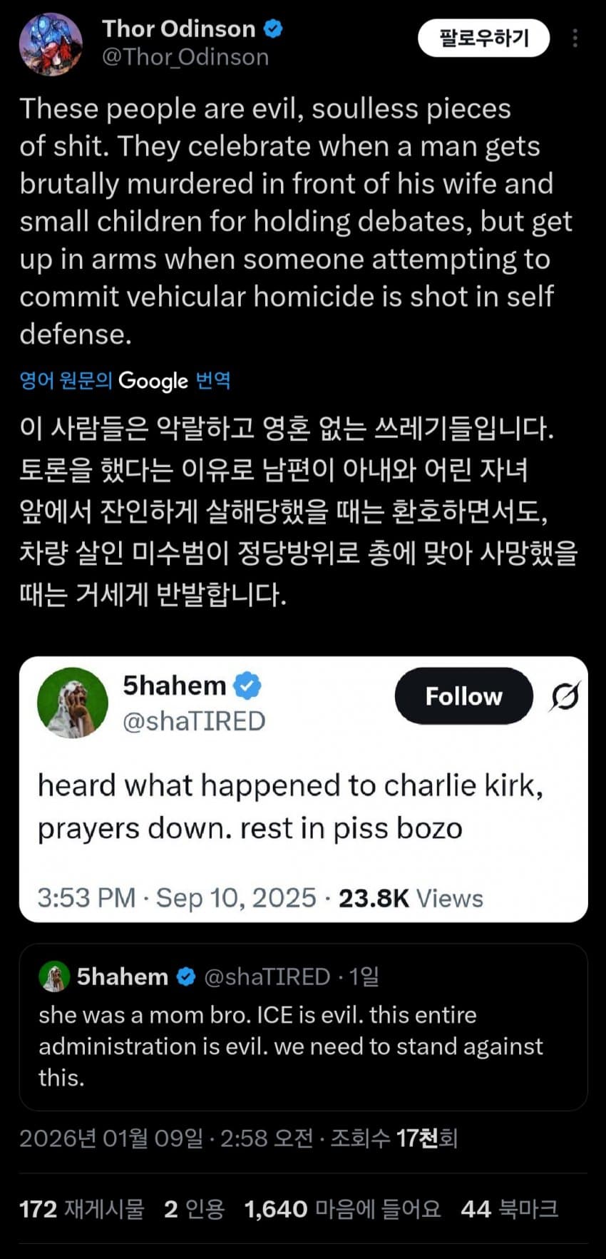 찰리 커크 살해를 정당화하고 축하하며 날뛰던 좌파들이