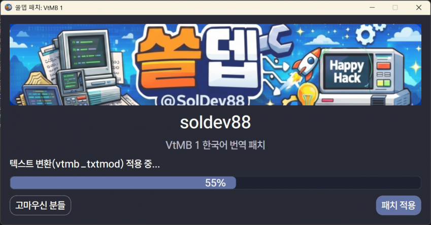 먼저 TTF 폰트를 받아서 설치해 주시고, 그 다음 원클릭 패치를 내려받아 실행하신 뒤 VtMB 게임설치 디렉토리를 선택해 주시면 됩니다. 해당 디렉토리에는 반드시 Unofficial Patch가 설치되어 있어야 하며(GoG Galaxy판이면 기본 설치되어 있음), 게임 실행은 GoG Galaxy의 Play 버튼 또는 loader.exe에 의한 Unofficial Patch 로딩 모드로의 실행으로만 이루어져야 합니다.