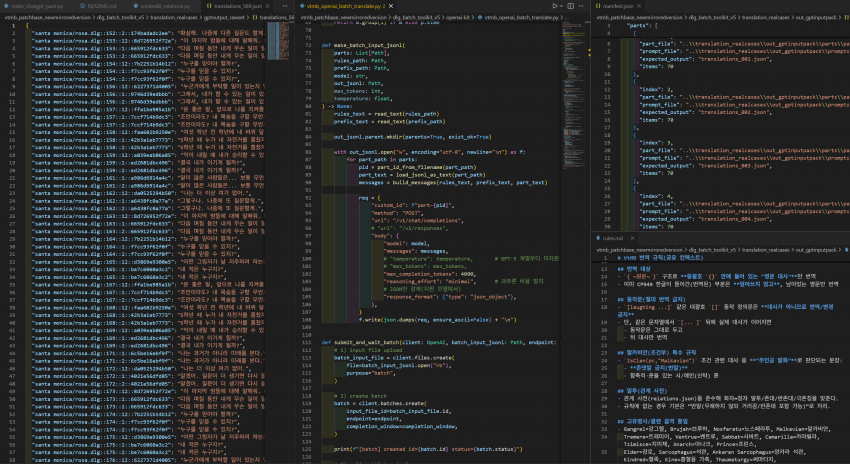 아무튼 초벌번역까지는 했지만, 칸이 안 맞거나 세계관의 적절한 번역어가 아니거나 너무 늘어지게 번역한 부분은 다 고쳐야 합니다.그리고 이 지점까지 온 뒤 탈진해서, 남은 dlg와 lip은 LLM으로 번역을 돌리고, 다만 초벌번역 특유의 못 써먹을 번역 문제를 어느 정도 예방하기 위해 RAG를 하나 구현하고 그것을 통해 API를 호출해서 어찌어찌 해결했습니다. 벌이가 안 좋은 구멍가게 수준 외주 겸업 개발자인지라 최대한 효율적으로 일을 처리시켜야 했습니다.
