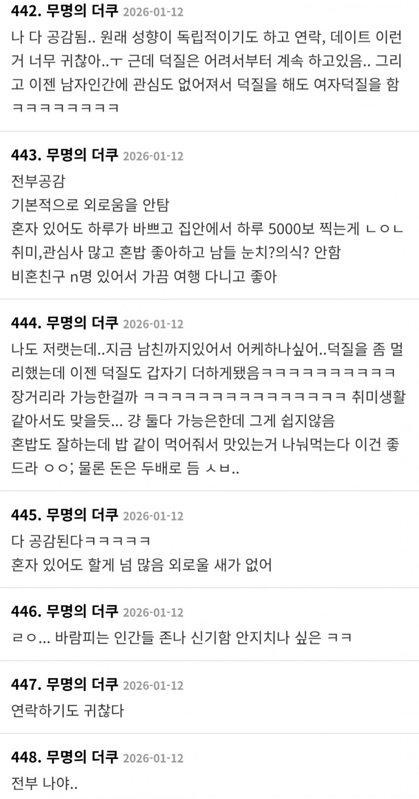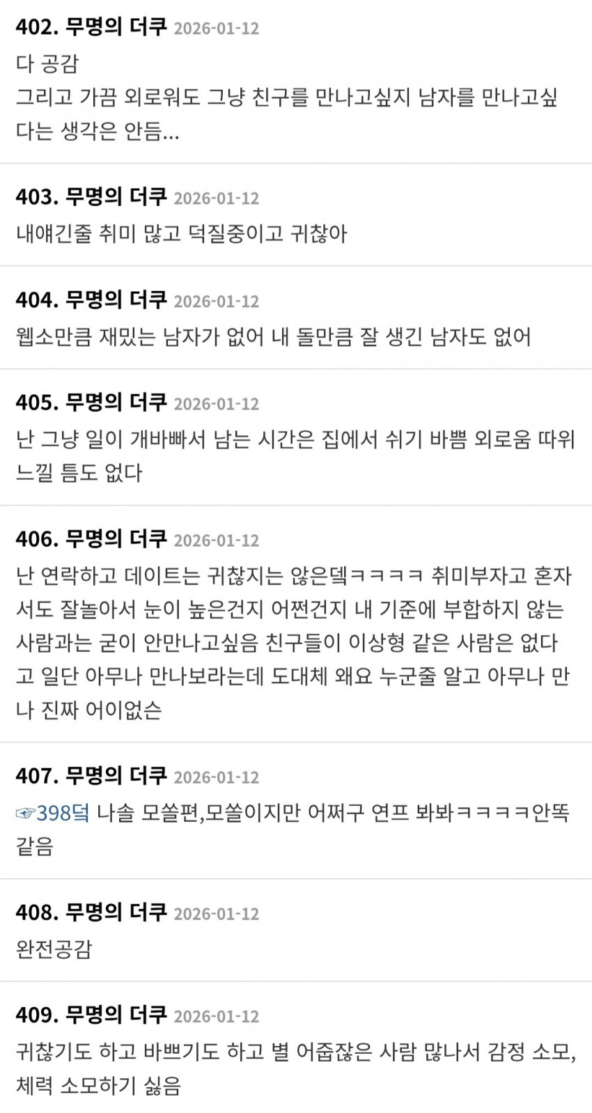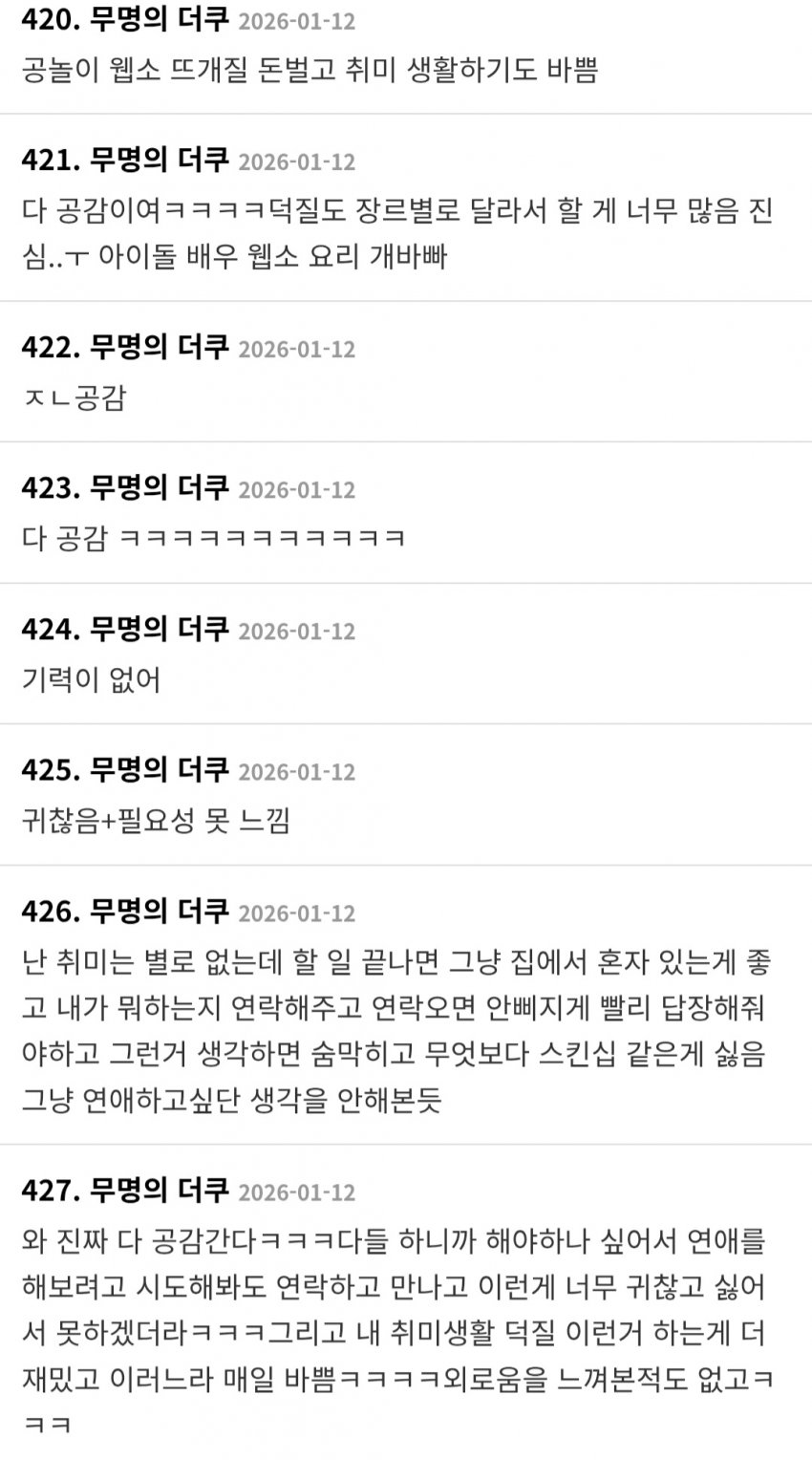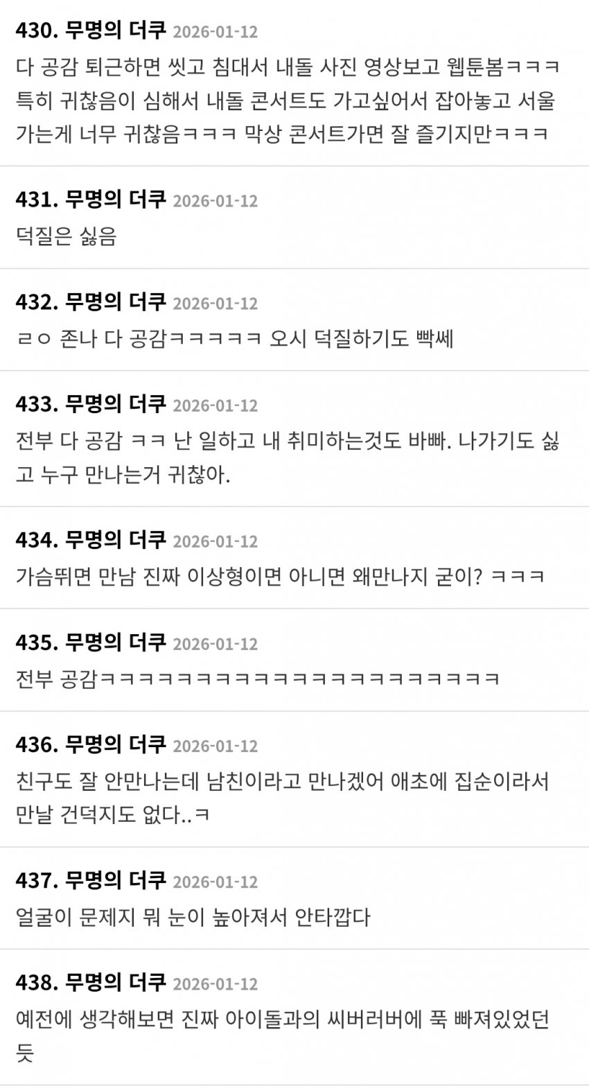 주갤이나 더쿠나 나이대는 비슷한가본데 차라리 저게 더 보기나은데? 나이먹고 이성에 대한 미련 못잃고 국결이니 자국이성 후려치기하고 그런거에 용쓰는거보단 그냥 취미활동하고 사는게 낫구만