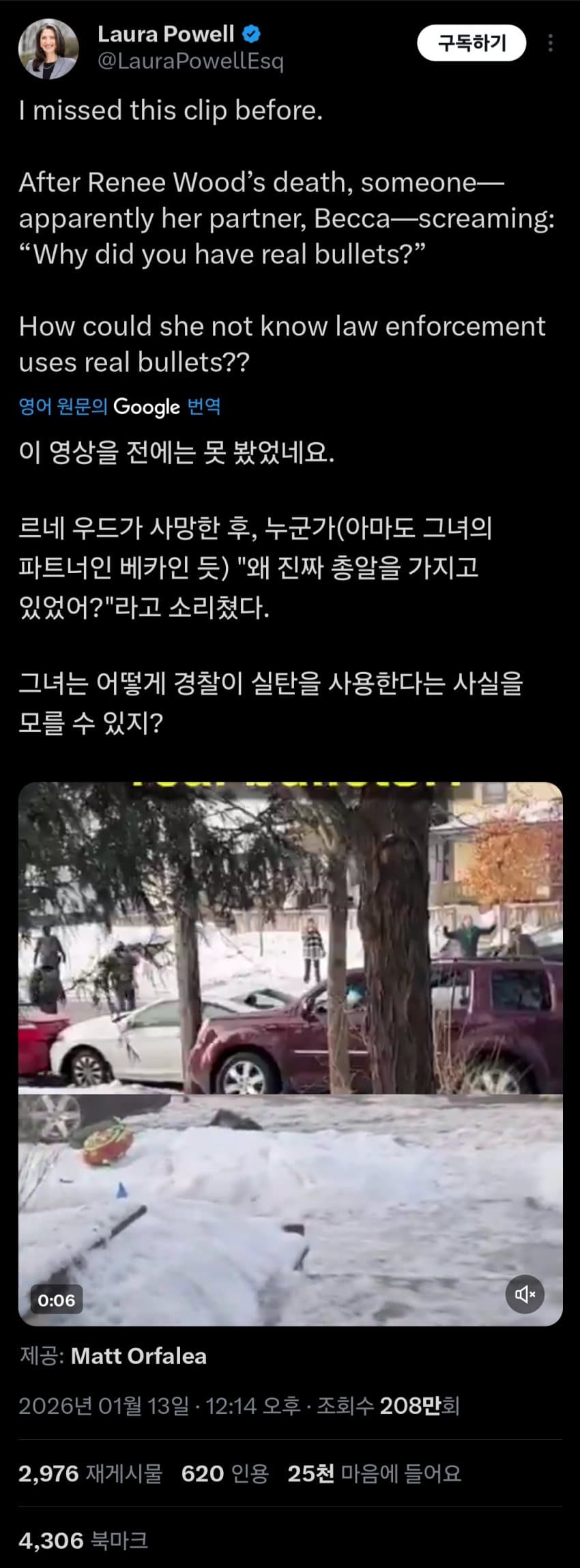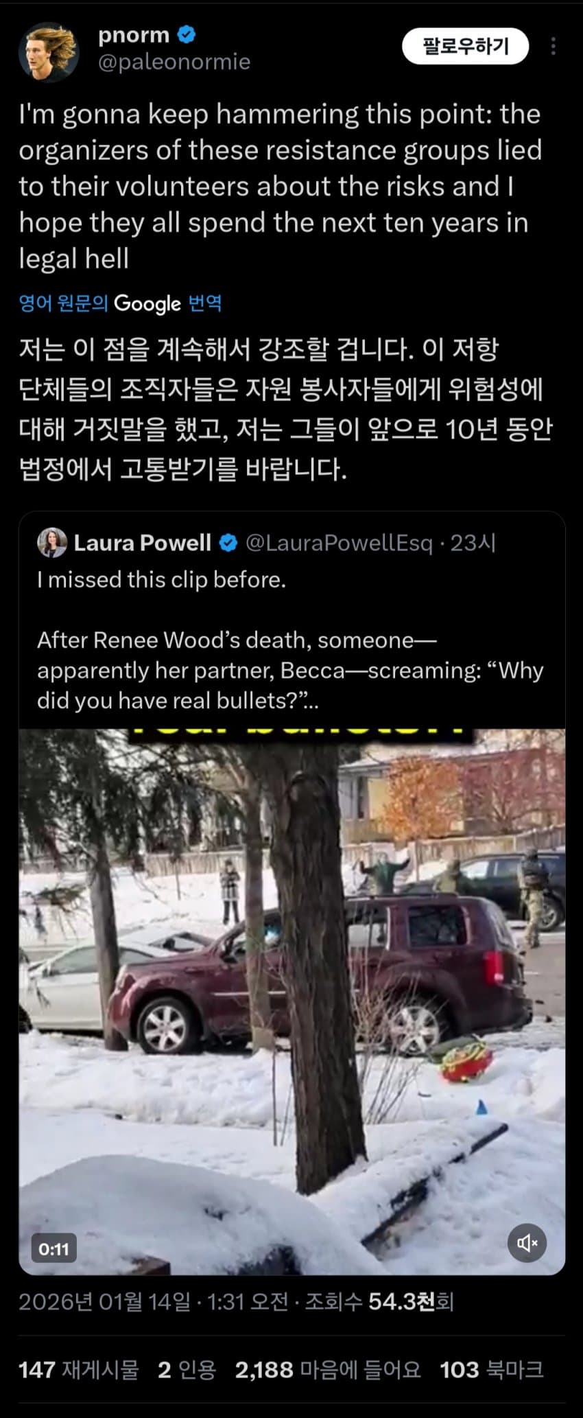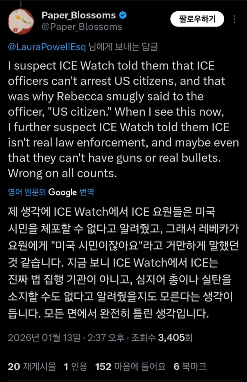 ICE 요원들에게 "왜 진짜 총알을 가지고 있는 거냐"고 울부짖는 영상이 인터넷에서 주목을 받고 있음