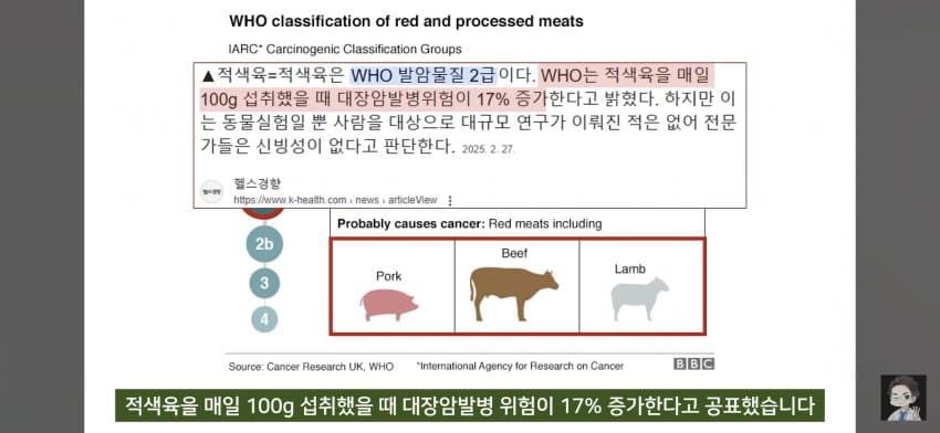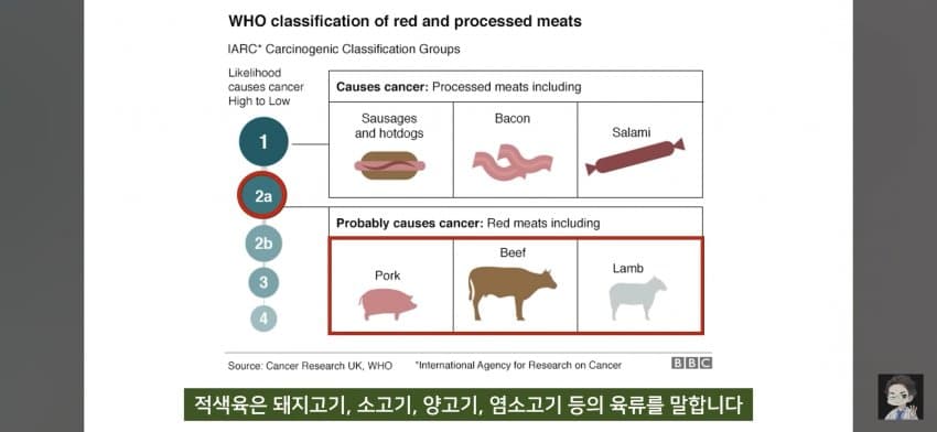 WHO는 적색육이 대장암발병률을 17퍼센트 증가시킨다며 2급 발암물질로 지정한다.