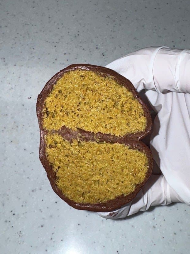 두툼한 필링과 쫀뜩한 맛을 강조하여 위아래로 매우 두꺼운 형태를 하고 있음