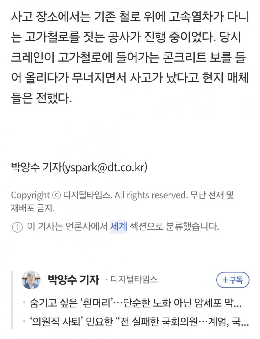 와 달리던 열차에 크레인이 무너졌다고..사실상 충격량만 따지면 기차속도로 맨몸으로 크레인몸체에 박은거랑 똑같겠네...끔찍하다