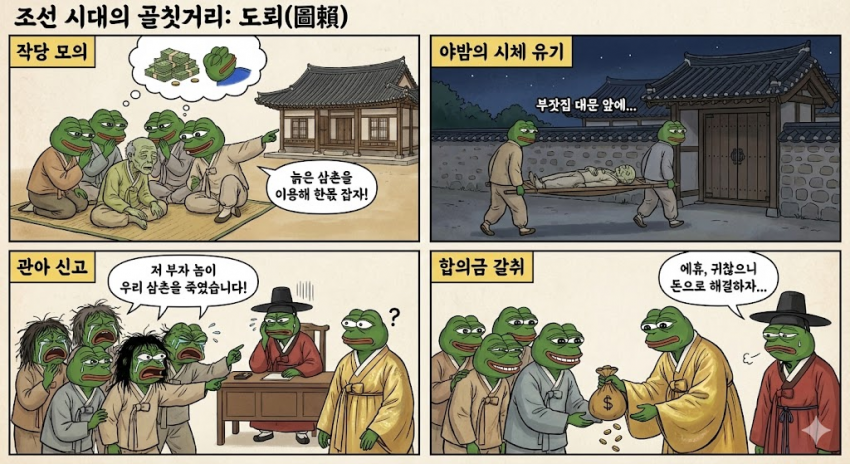 조선 시대 지방 수령들이 가장 골머리를 앓았던 것이 바로 이 도뢰였음수법은 다음과 같음1. 집안에 늙고 병든 노인이나 자살한 친척이 생기면, 악한 마음을 먹은 일가족이 작당을 한다.2. 이 시체를 밤에 몰래 짊어지고 평소 원한이 있거나 돈이 많은 부잣집 대문 앞, 혹은 그 집 우물가에 가져다 놓는다.3. 다음 날 아침, 관아로 달려가 머리를 풀고 통곡하며 신고한다. " 저 부자 놈이 우리 삼촌을 때려죽였습니다!"4. 살인 사건은 수령에게 가장 큰 부담이기도 하고 부잣집 주인은 심문을 당할 것이 두려워 거액의 합의금을 내놓게 됨심지어는 독극물을 먹고 자살하려는 사람을 부추겨, 부잣집 안방에 들어가서 죽게 만드는 경우도 있었음내 목숨을 팔아 가족에게 한 밑천 남겨주는 자살 특공대였던거