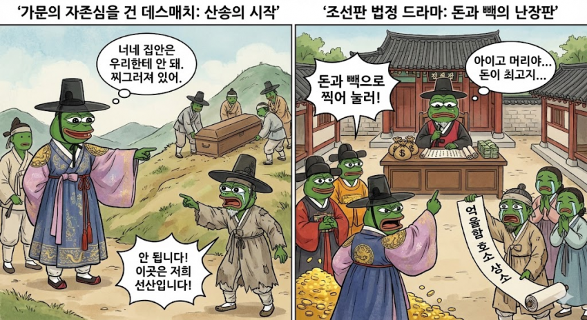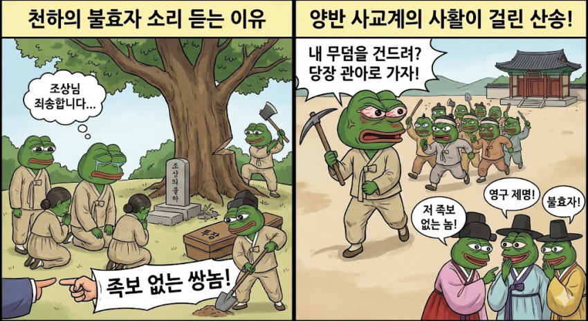결론적으로 산송은 단순히 우리 조상님 좋은 곳에 뉘어드려야지~ 하는 효심이나 미신 때문만이 아니었음양반으로서의 도덕성 입증 (명예),산림 자원 독점권 확보 (돈),지역 사회에서의 영향력 과시 (권력)이 세 가지가 복합적으로 얽힌, 조선 양반들에게는가문의 명운을 건 총력전이었던 것임그러니 밤마다 불법으로라도 남의 무덤 파헤치러 다니는 행각이 벌어질 수밖에 없었음이는전국을 거대한 묘지 전쟁터로 만들었음남의 선산이라도 명당처럼 보이면 밤에 몰래 가서 시체를 묻고 평평하게 다져버렸고..날이 밝으면 원래 묘지 주인은 "내 조상 머리 꼭대기에 누가 시체를 묻었냐!"며 곡괭이를 들고 달려갔음