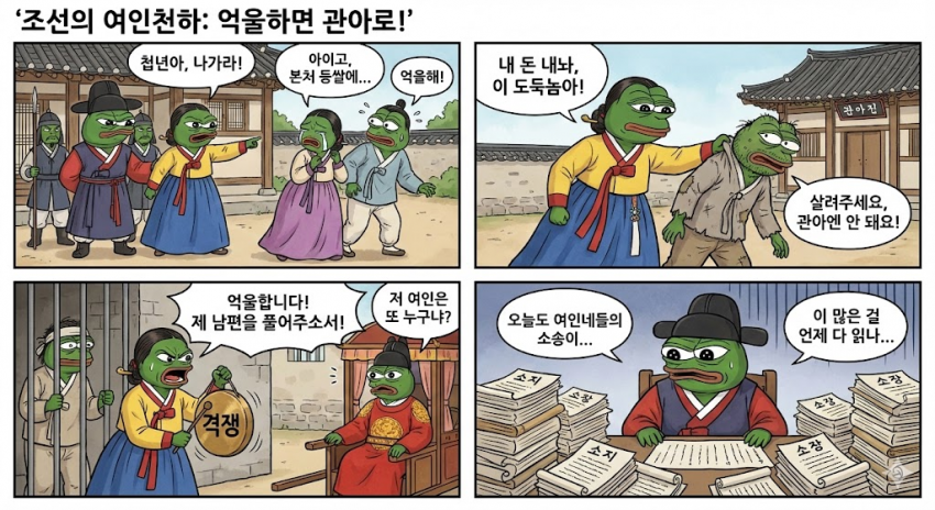 심지어 숙종 때는 한위겸 이라는 외지부가 관아의 도장(관인)을 위조해서 가짜 판결문을 만들다가 걸리기도 했음공문서위조죄? 조선시대엔 그 자리에서 목이 날아갈 수도 있는 중죄임에도 알면서 저지랄을 한거임말빨로 안 되면 돈으로 해결했음사또의 비서 격인 아전들에게 뒷돈을 찔러주고 유리한 판결을 유도했으니,돈 없고 빽 없는 진짜 피해자들은 피눈물을 흘릴 수밖에.