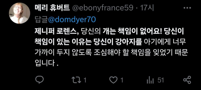 개빠 극성인 것도 아는데 개가 일으키는 모든 책임은 견주가 지는게 맞음 그럼 개가 물었으면 누구 잘못? 견주 잘못 근데 개탓을 왜함 ㅋㅋ
