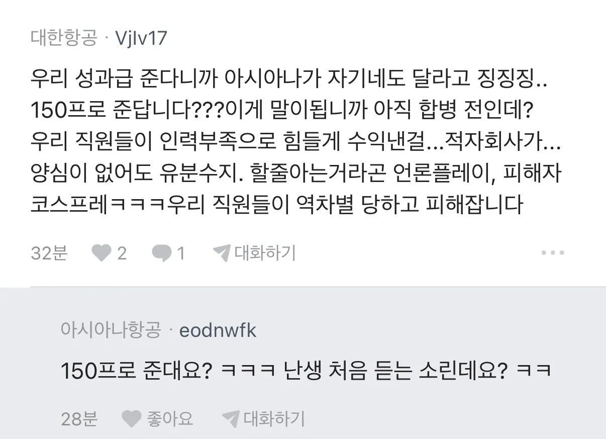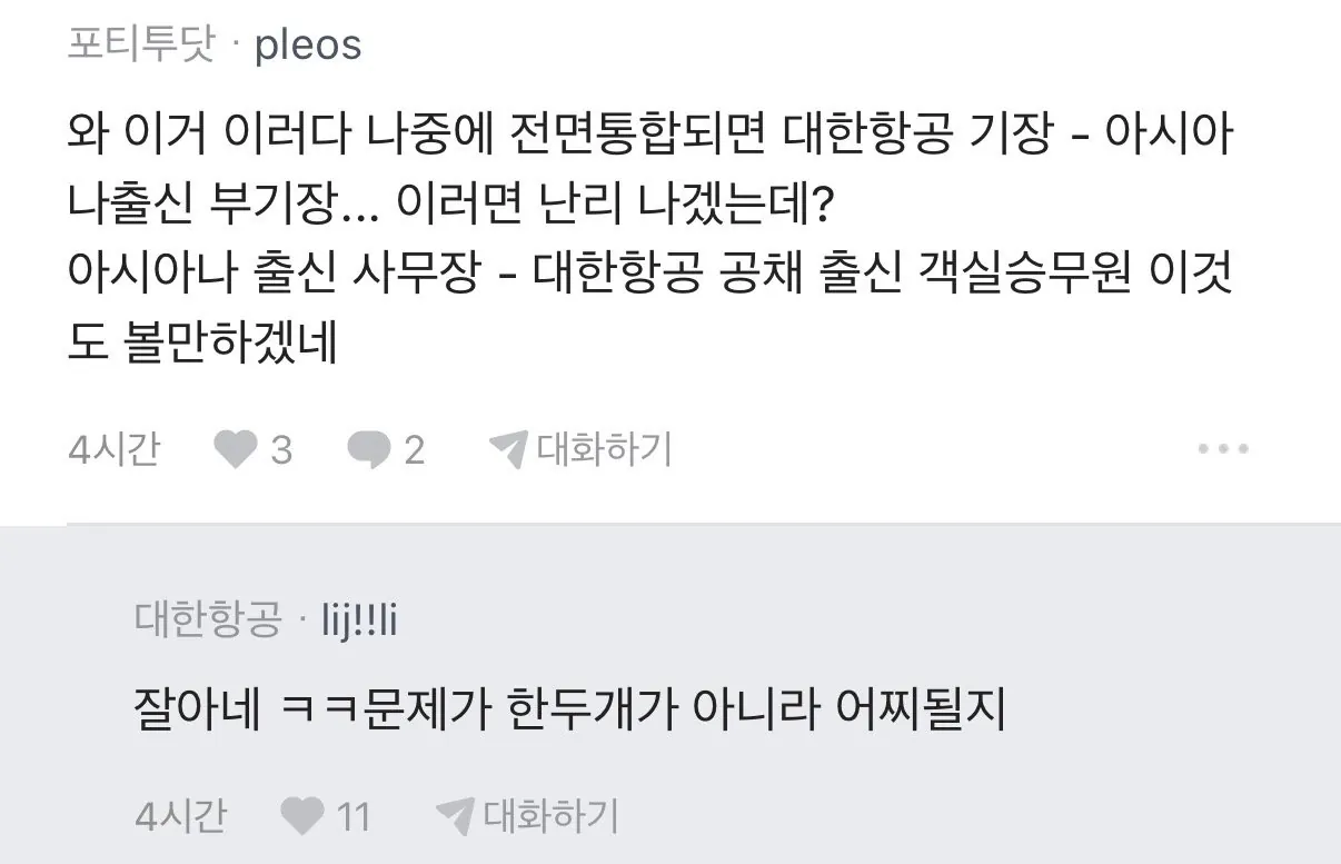 여기서도 갈라치기냐? 대다수 직원들은 자기 할 일 바뻐서 신경도 안 쓸것 같은데?? 비행기 타고 일하고 내리고 집에 가서 쉬고 비행기 타고 일하고 내리고 호텔 가서 쉬고 하는 아이들이 대한항공 아시아나 출신 이런거 신경 쓴다고??