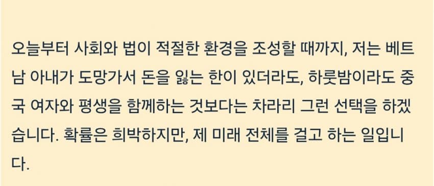 베트남 아내가 도망가는한이 있어라도 중국 여자와 결혼하는것보다는 낫다.