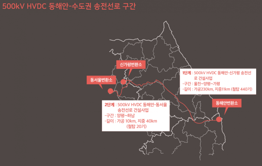 500kv 동해안-수도권 HVDC 사업은 완료만 된다면 동해안에서 8GW의 전력을 수도권으로 수송할 수 있는데, 이는 신형 원전 6기와 맞먹는다고 한다