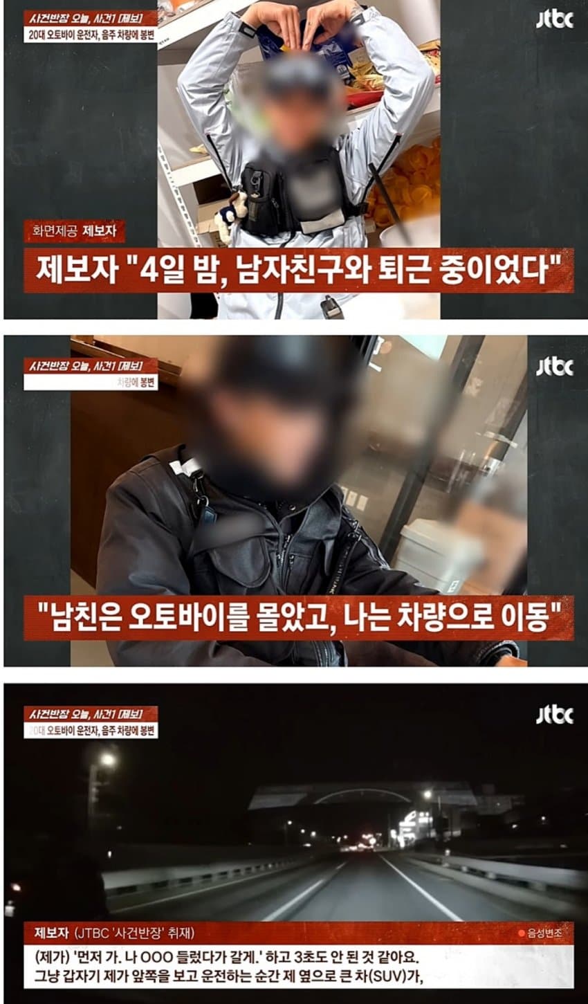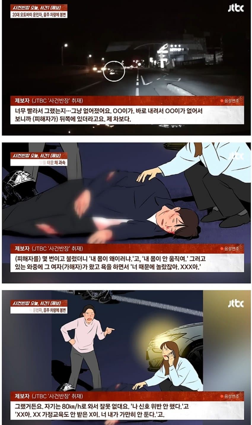 펙트말해드림 오토바이는 1차로 주행하면 안됨...그리고 둘이서 로드멜로무비 찍었는지 나란히 평행주행 함...둘중 하나만 지켰어도 안났을 사고라는 점에서과연 피해자가 온전히 피해자인가 하는 의문이 남음세상에 개같이 짖을수 있을때는 내가 할 의무를 다 했을때에 한정함그럴때에는 진짜 세상탓 하면서묻지마할수있는거임