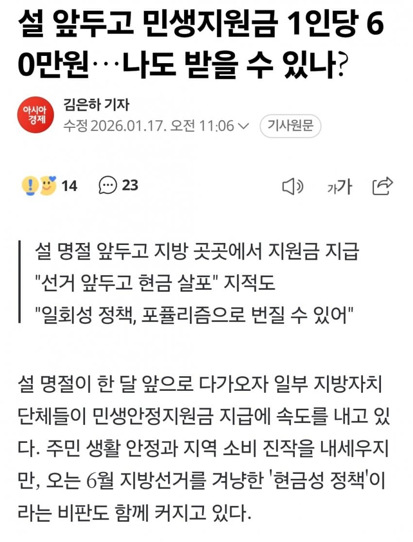 설 앞두고 충북•전북 민생지원금 지급