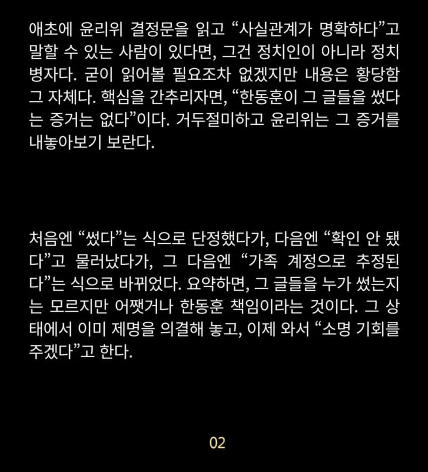 난 한동훈 자체는 국힘 상황에 도움 된다 생각함...근데 사람 자체가 좀 비호감임; 가발, 키높이 깔창... 까지는 뭐 이해함. 근데 어깨 뽕, 가슴 뽕... 이건 도무지 상식선에서 이해가 안됨;;거기도 뭔가 대화할 때도 보면 뭔가 항상 불만이고 전투적임 어릴때 이준석 보는 느낌;마지막으로 일단 말을 너무 못함... 저번 선거 때 지역에 돌아 다니면서 선거유세 영상 몇 개만 봐도 쓰는 단어 몇 개 없고 내용도 1도 없음...뭔가 마음을 움직이는 언변이 너무 약함. 그게 안되면 장기적으로 대중에게 다가서기가 너무 힘든데 그게 넘 아쉽..