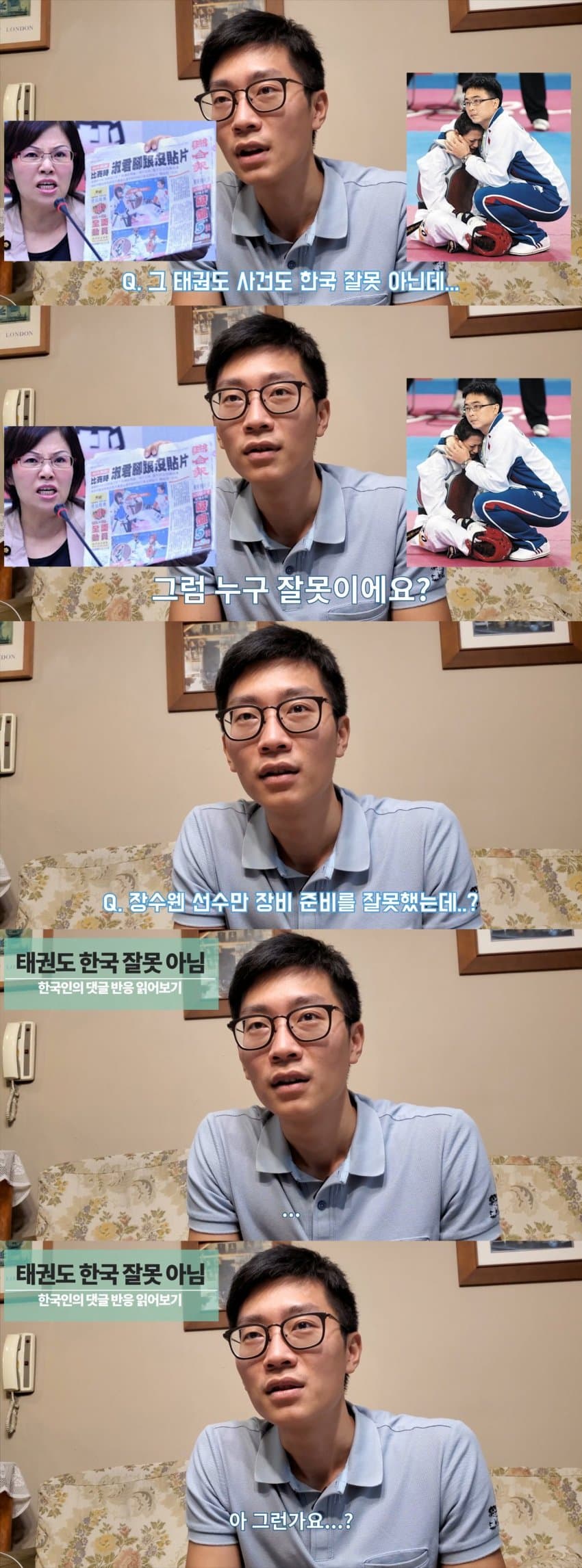 "중국이 개최한 태권도 대회에서 장비검사 이후에 대만인이 불법센서장치를 부착하고 동남아인들끼리 동남아인 심판들 앞에서 경기하다가 센서 적발당해서 실격당해놓고" 한국인들이 반칙을 하잖아요 ㅇㅈㄹㅋㅋ