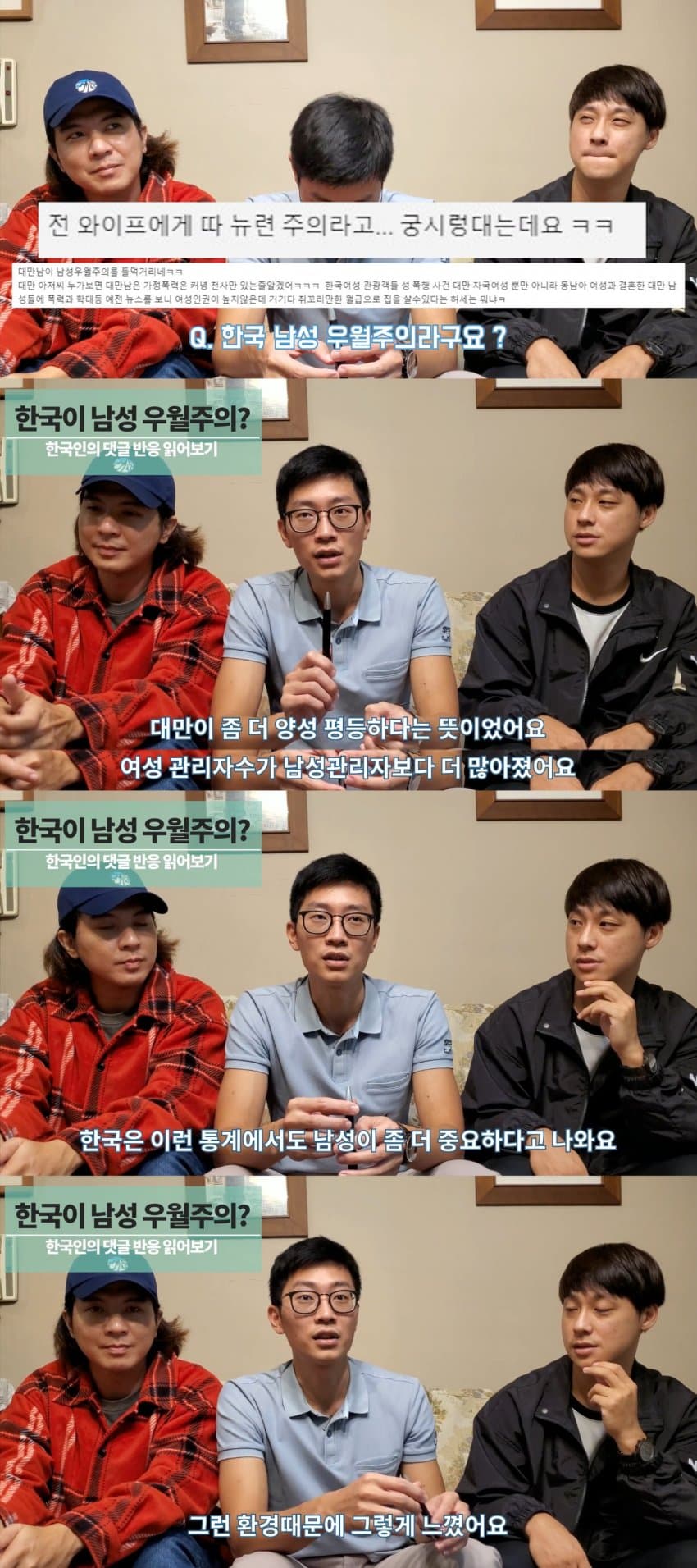 말하면서 여자처럼 박수치는거나, 이유를 물으니 그냥 느낌적인 느낌 이러는거나행동이 그냥 여자같은데? ㅋㅋ한국인들이 남성우월적인게 아니라 저게 대만평균이면 대만남자들이 계집화되어있는듯