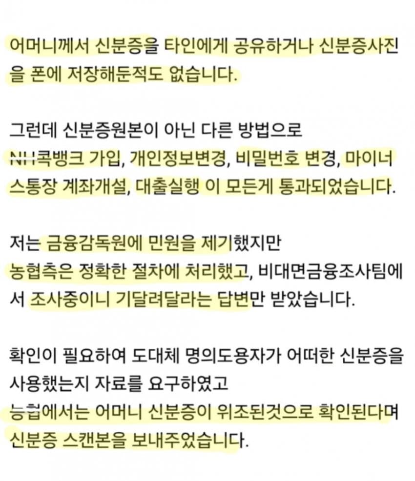 농협이 문제된게 나라에서 비대면 신분증 인증 시스템 만들어줘서 의무화된지도 좀 됐는데 이상한 신분증으로 대출된 유사은행이라서 그런걸로 기억함털린적은 있는데 재발될 가능성이 없다고 안심하다가 훅 들어온 이슈