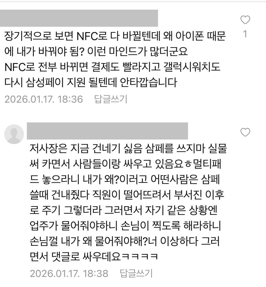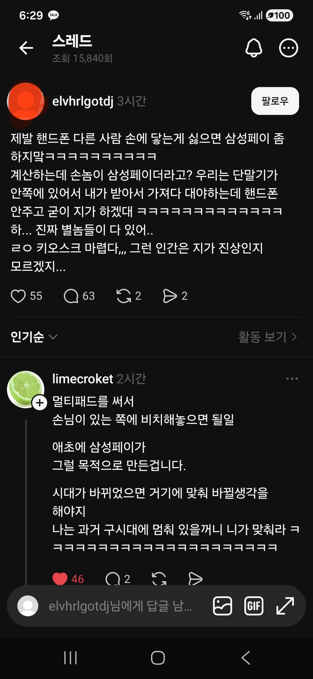 잠시 결제를 위해서라도 손님들은 타인이 폰 만지는 걸 꺼려한다는 사실을 파악해서 멀티 패드로 개선할 생각은 죽어도 못하고 돈 들어가니까 그저 진상 손님 타령만 해대노ㅋㅋㅋㅋ저러고 장사 안되면 또 징징거리겠지?ㅋㅋㅋㅋㅋ애초에 자기 폰이 잠시라도 타인 손에 들어가는 걸 꺼려하지 않는 인간이 어디있노ㅋㅋㅋ