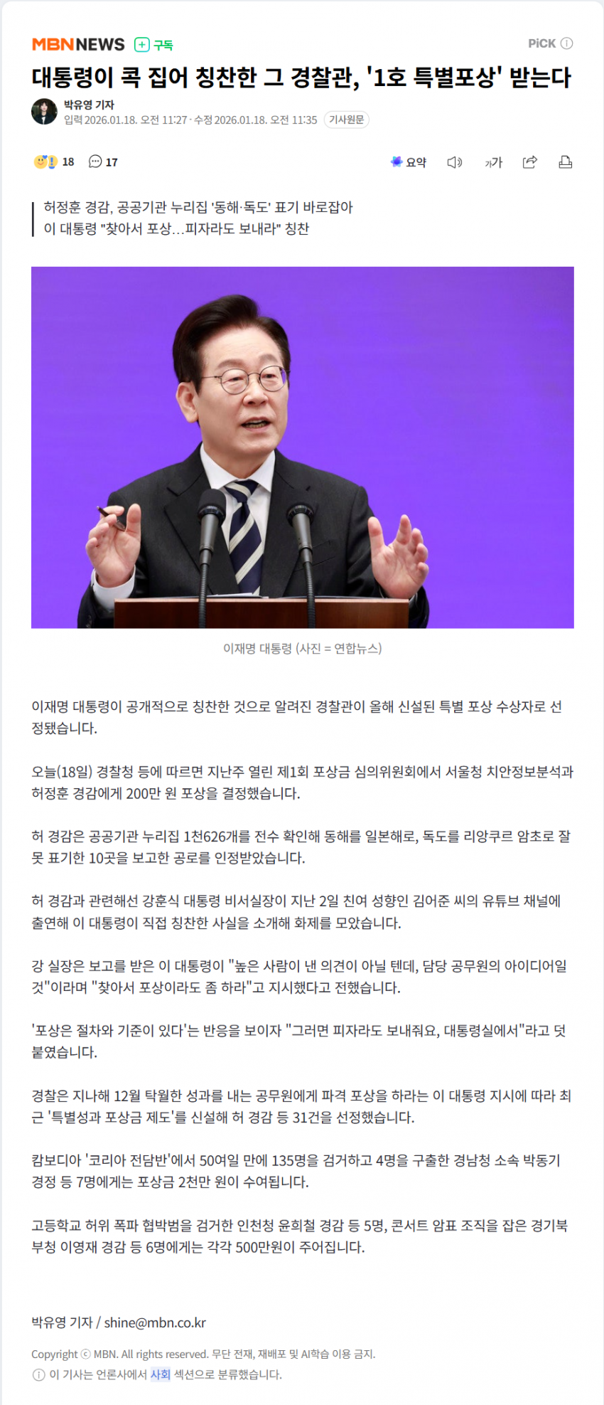 일본해, 리앙쿠르 암초로 표기된 걸 보고한 경찰, 대통령 1호 특별포상