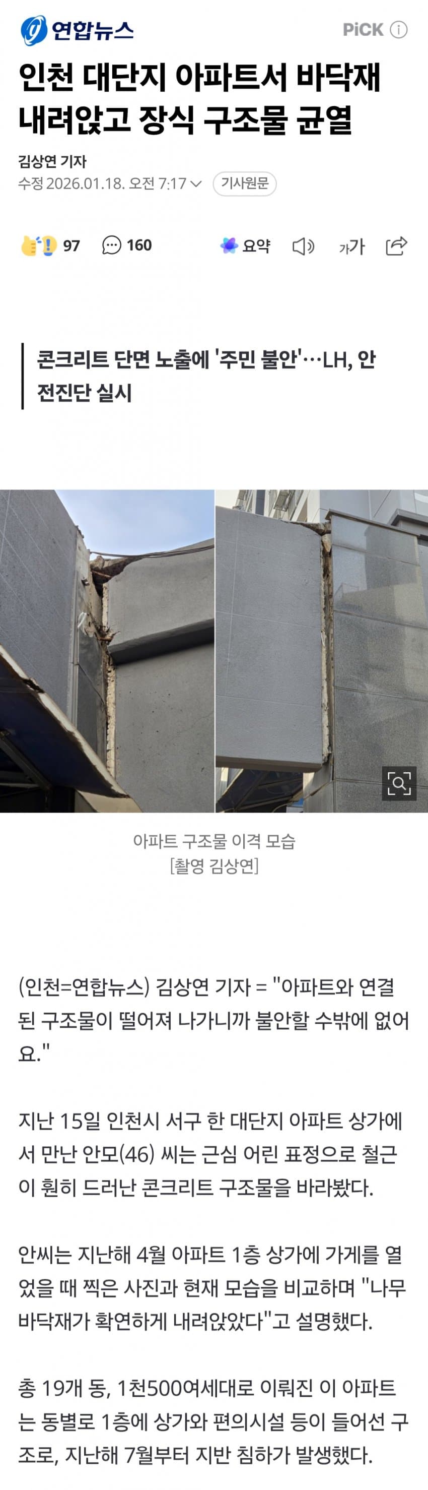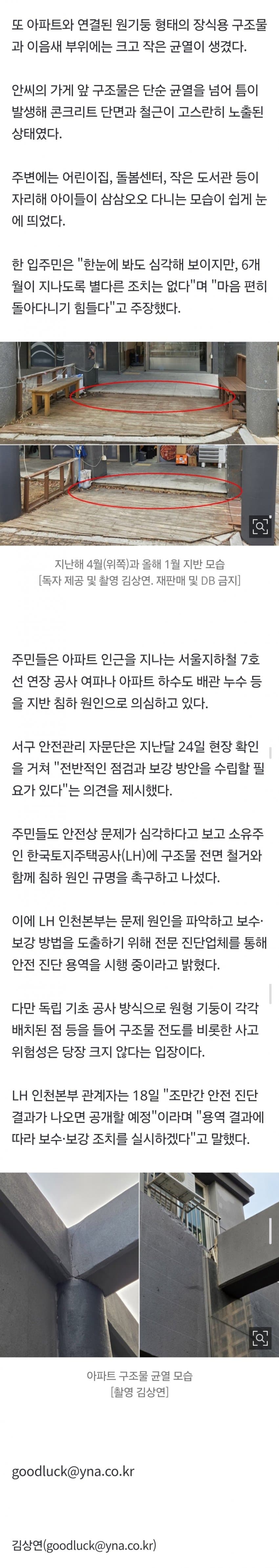 인천 대단지 똥파트서 바닥재 내려앉고 장식 구조물 균열