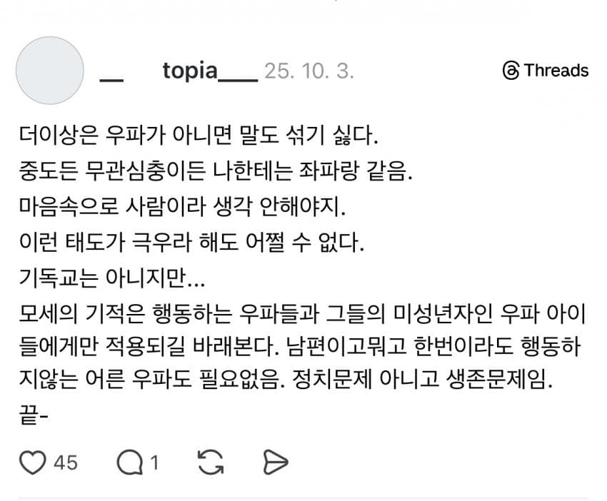 내가 맞다고 억지 부리진 않는데, 상식이 나와 너무 달라 말이 안통해. 정치색 매우 중요하다