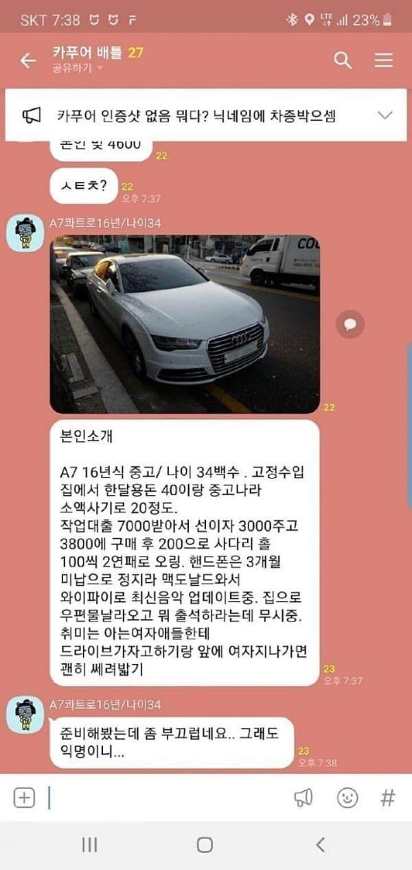 그냥 중고차팔이들이 홍보용으로 주작하는건줄 알았는데 진짜 저런 카푸어가 있다고? 그냥 요즘 없는 이유는 중고차 업자들 대부분 뒤져서 그런거 아닌가