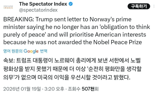 그깟 노벨상 못받았다고 땡깡부리는 트럼프나 기싸움한다고 트럼프 노벨상 안준 노르웨이나