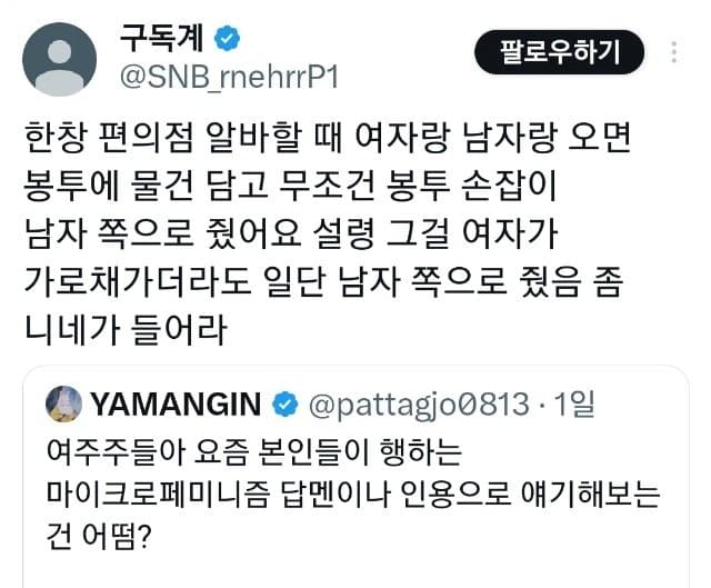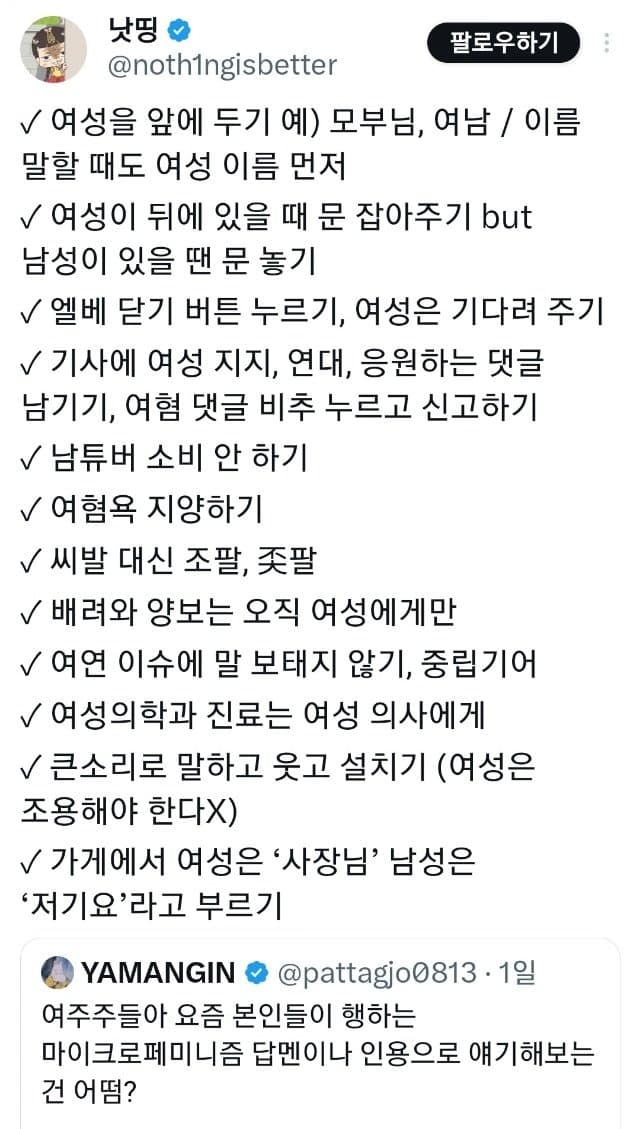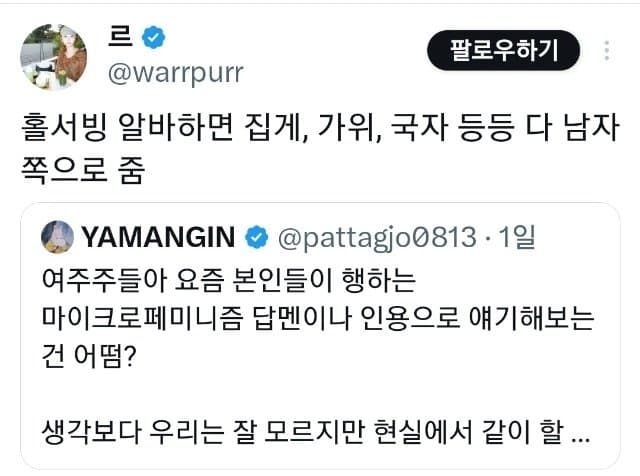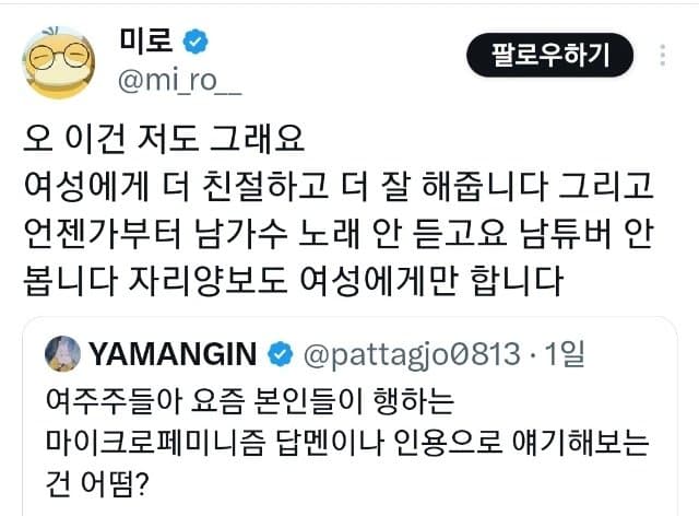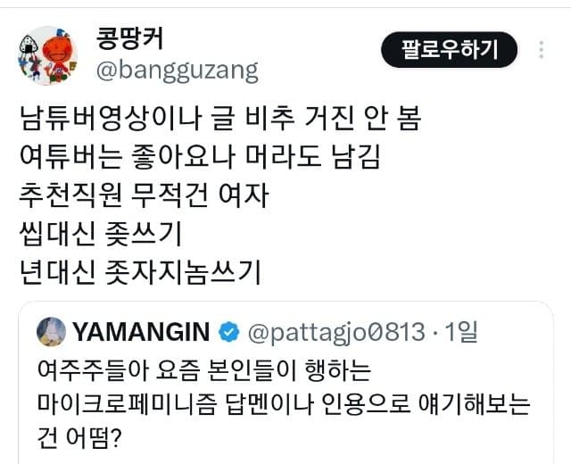 다른건 몰라도 저렇게 행동하는 게 여성 버튜버들에게 도움 된다고 믿는게 진짜 안스럽다현실은 안 그래도 여성시대에 버튜버 게시판 있는 거 때문에 신입 버튜버들은 매일매일이 사상검증의 나날인데 더 빡세지겠구만...
