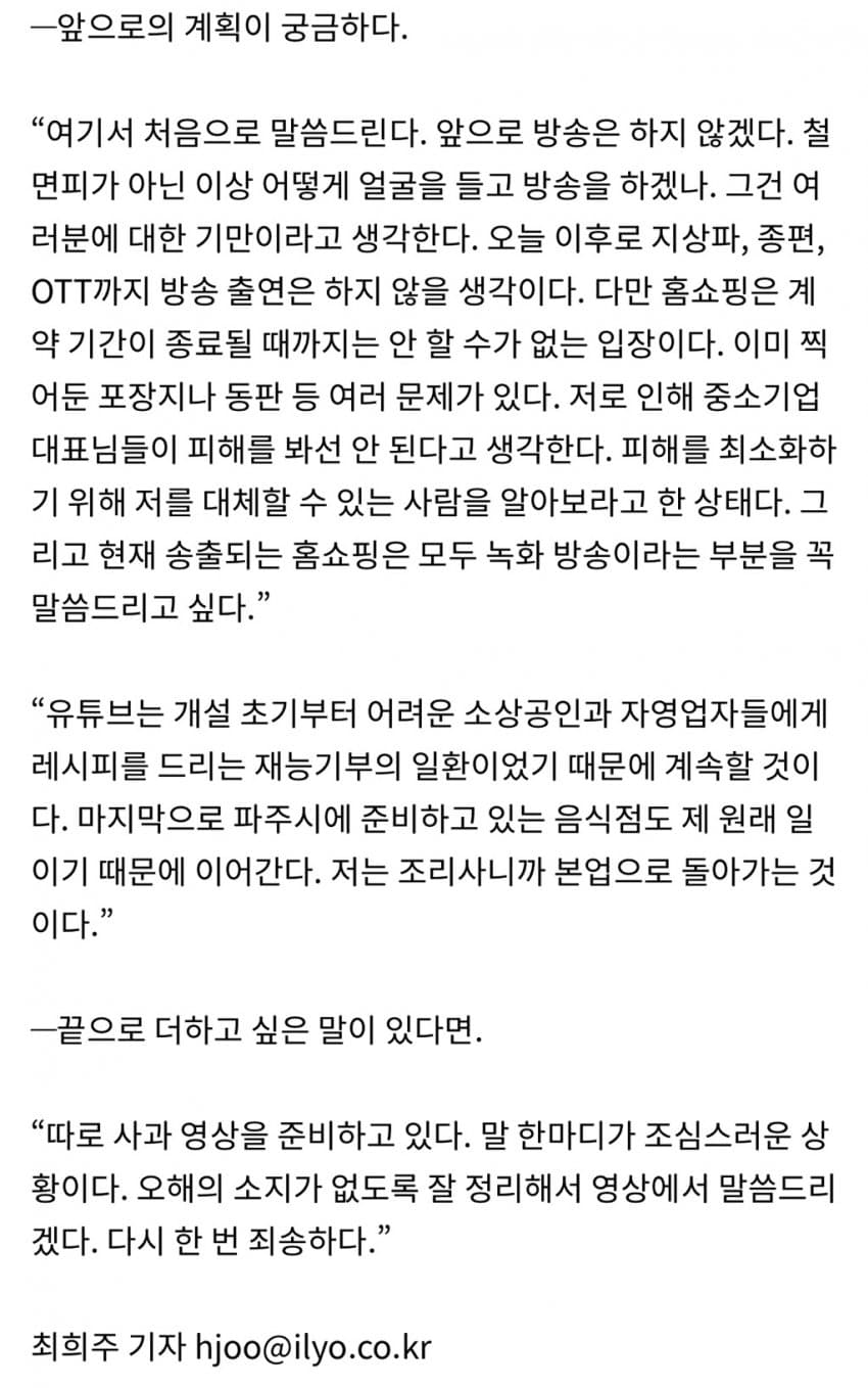 용서할 사람은 알아서 용서하도록 하고 이제 요리 전문가로서 본업에 충실하면 될듯. 백종원처럼 요리 전문가도 아니면서 대중의 사랑으로만 먹고 사는 사람도 아니잖아