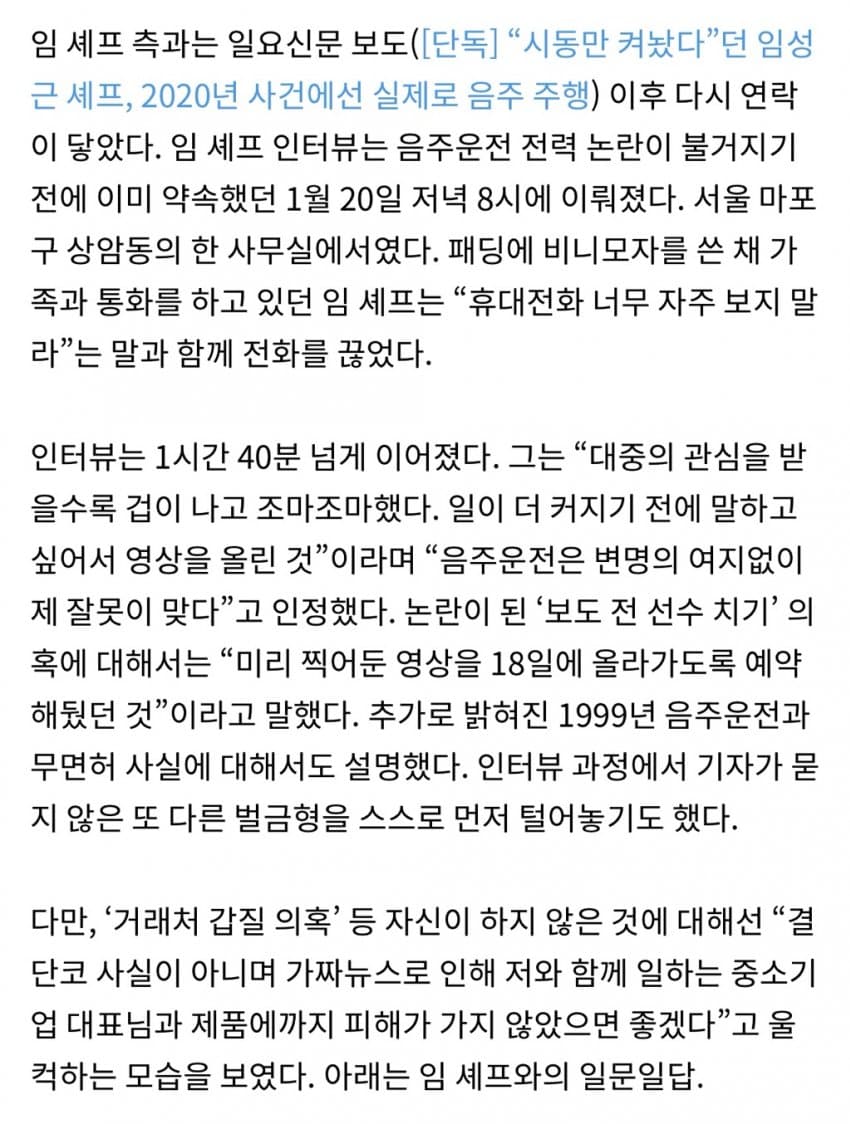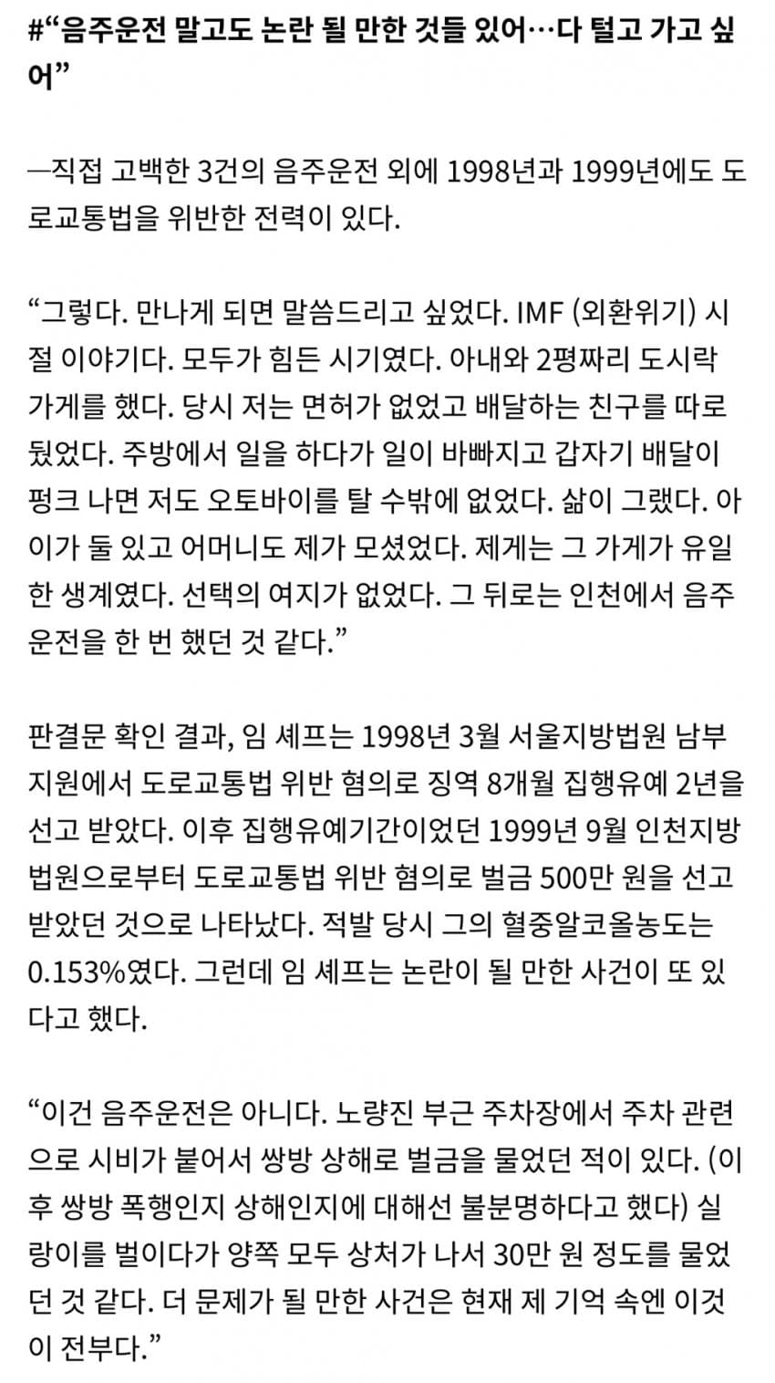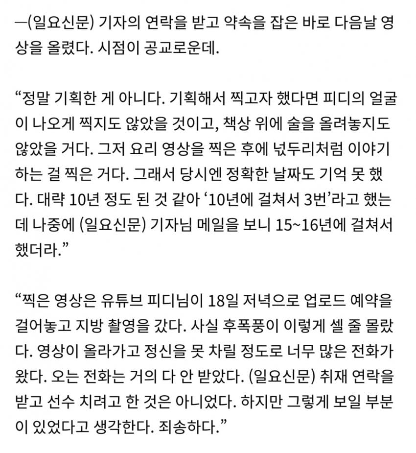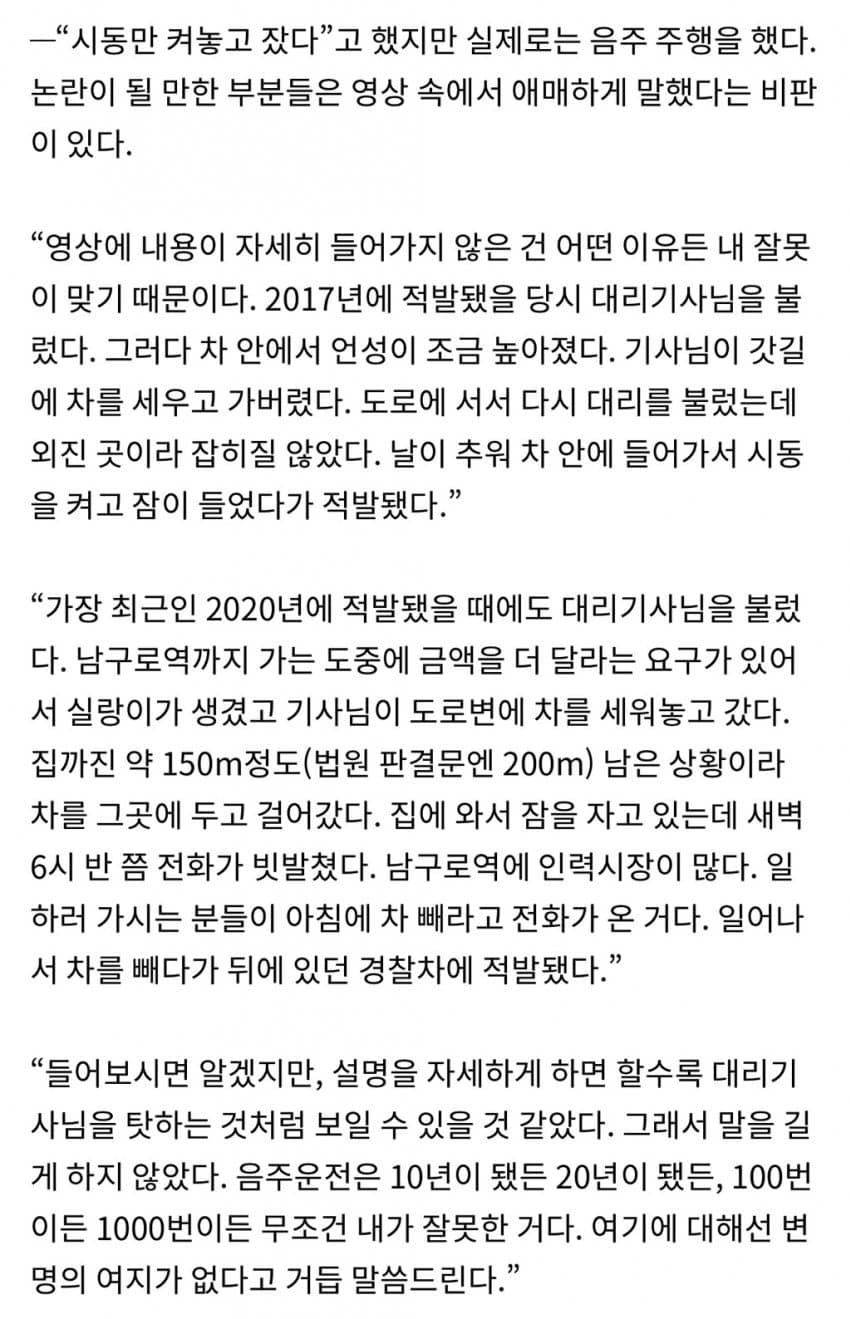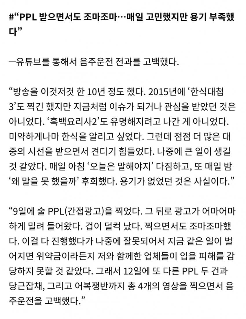 구구절절하게 들리겠지만 억울할 부분도 있어 보이네. 편집한 영상이 18일에 나갔다는 건 촬영도 미리 한 게 맞고. 그래도 오토바이 배달 나가야 하는 사람이 술은 왜 했으며, 그건 90년대 일이라고 쳐도 20년대까지 상습 음주운전을 하고, 방송 나가서도 만취하고 술 광고 받은 건 좀 그래