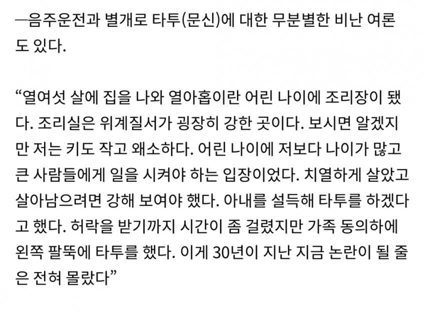 ㅇㄱㄹㅇ이지. 힘들게 살았다면서 몇 백 만원 짜리 타투할 돈이나 벌금 낼 돈은 있으셨나 봐. 나 같으면 벌금 무서워서도 술 마시면 택시 타고 다니겠구만