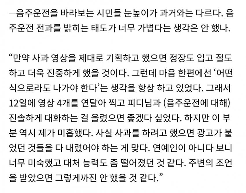 인기를 한창 끌 때 선수 쳐서 "사실 음주운전 경력이 있따 죄송하다 잘못하고 반성하고 있는 삶을 살고 있었다"고만 했어도 이렇게 까지 여론이 반전되지는 않았을텐데 "취재가 시작되자" 밝힌거여서 딱히 다시 봐주거나 재고해줄 가치가 없음