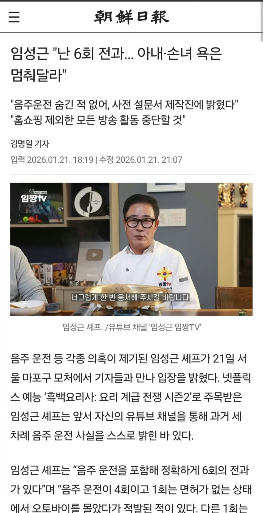 임성근 "난 6회 전과… 아내·손녀 욕은 멈춰달라"