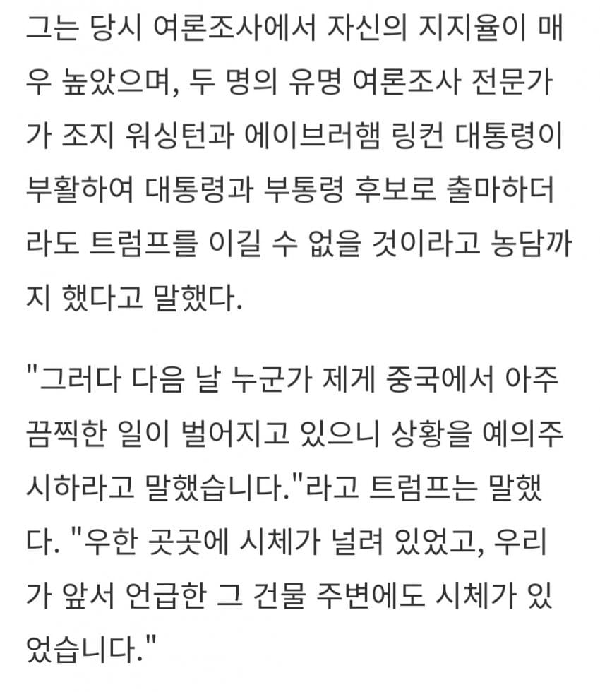진짜 트럼프가 재선 확실한 상황에서 그놈의 '중국발신종폐렴' 때문에 나락감그래도 그 덕분에 지금 트럼프가 퇴임한 대통령이 아니고 현직 대통령일수 있게 되었으니 전화위복이라면 전화위복