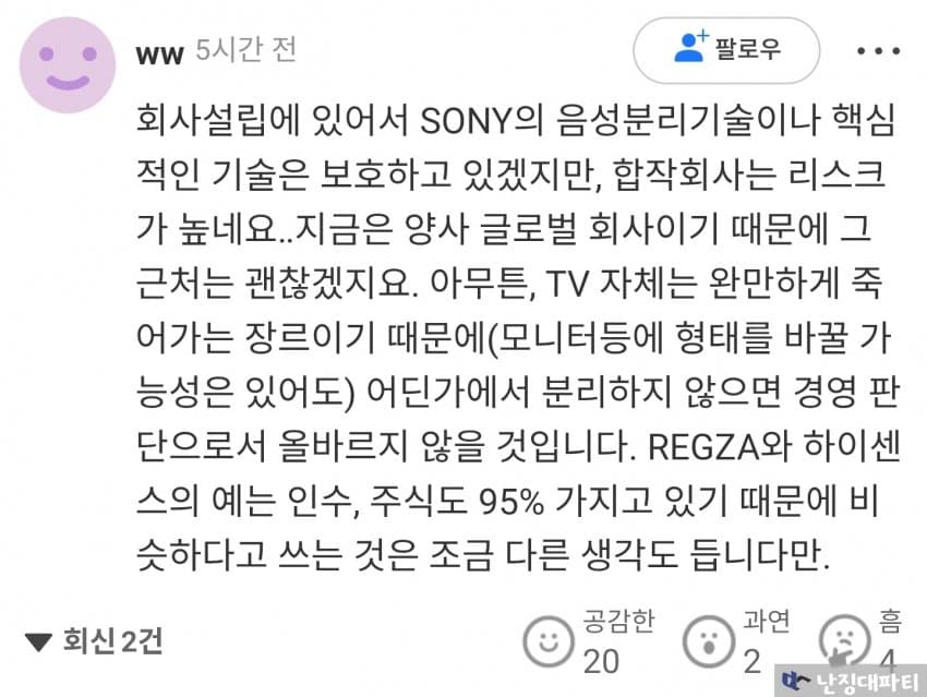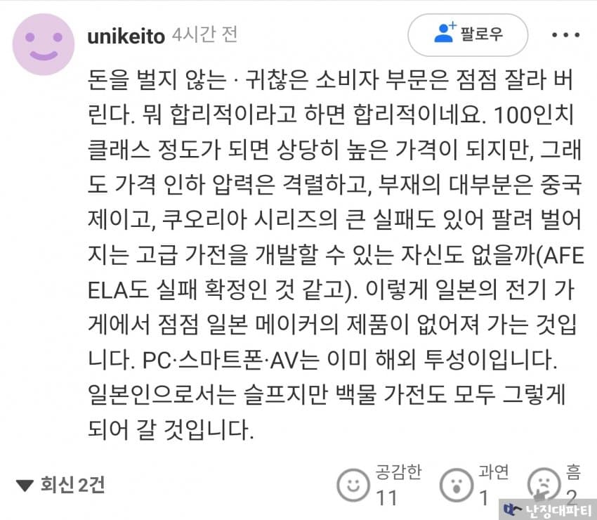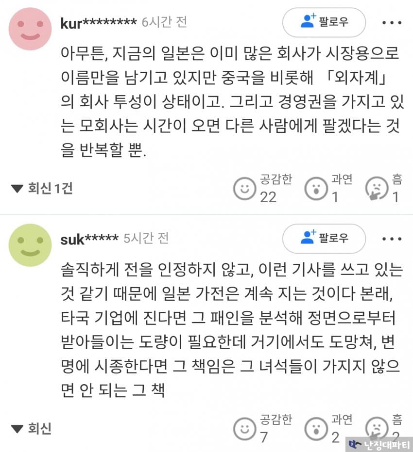 사실 일본 주요 가전 기업들은 이미 해외기업에 대부분 넘어간 상태라 소니가 그마나 체급빨로 오래 버틴 거라고 봐야함