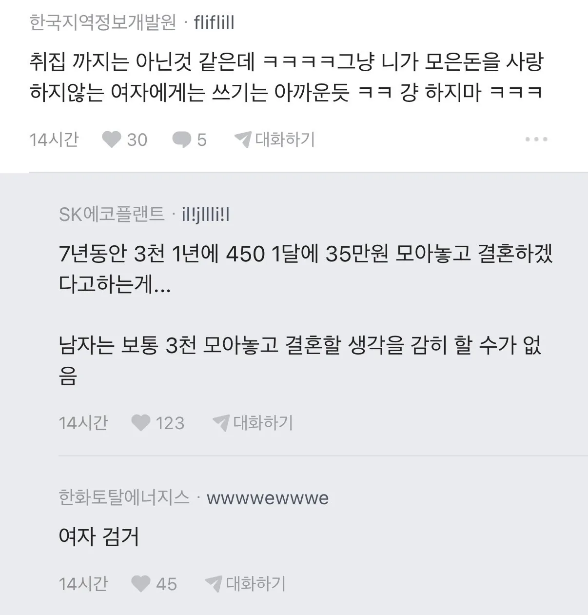 입장바꿔생각해봐라. 남자 3천에 결혼하자고 해봐라 쌍욕먹지. 오히려 그거보고 결혼하자는 여자가 찐사랑이다 ㅋㅋ