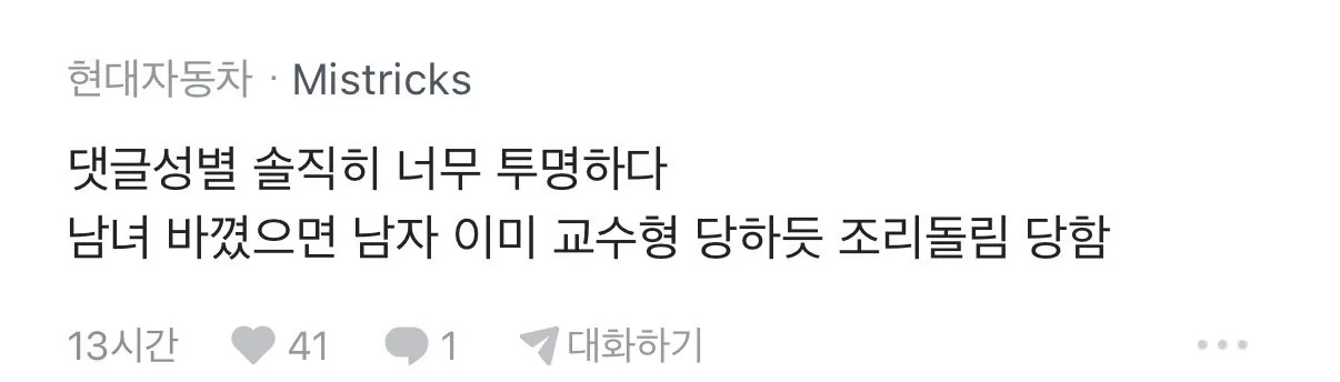 참 조선 샹년들 댓글 개역겹네 ㅋㅋㅋㅋ지년들은 온갖 카더라, 좋다더란가 다 소비하면서쳐살아놓고 남자에게 기대하는 꼬라지가성매매혼 그 자체네 ㅅㅂ