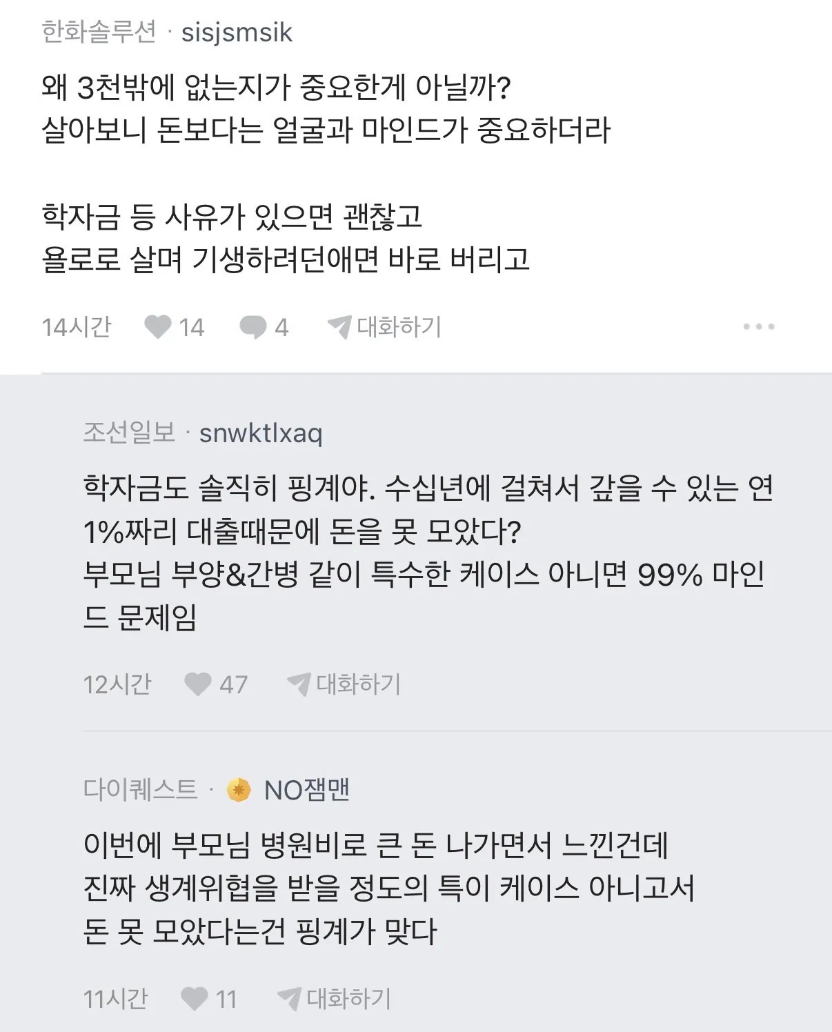 자기도 3천 모았다고 하고 반응을 봤어야지 ㅋㅋㅋ 벌이가 뻔했으면 집안에 큰 일 당해서 모은 거 다 썼다고 해서라도
